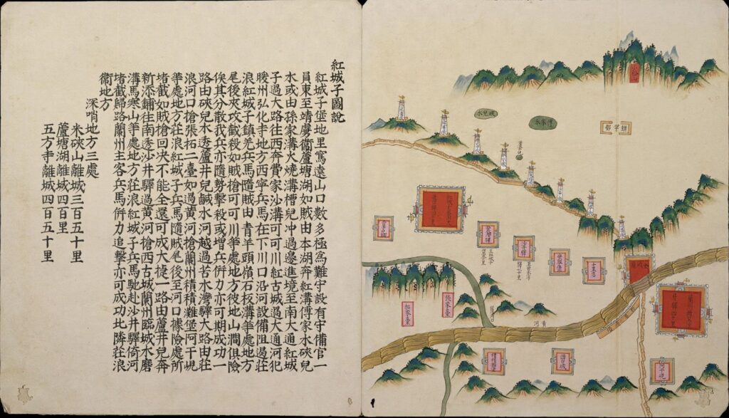 This map depicts the military defenses of the Gansu Garrison Command area during the Ming Dynasty from east to west.
