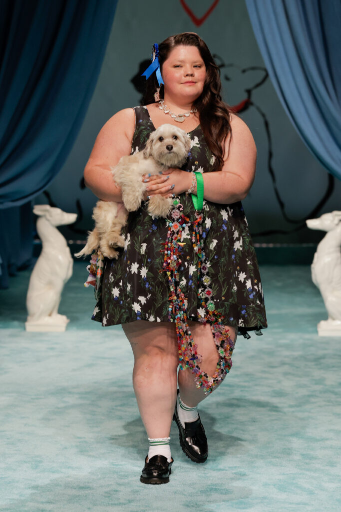 Down the teal-carpeted runway, lined by audacious canine motifs and grandious bouquets, walked a curated cast of models, actors, musicians, comedians, and dancers—Paloma Sandoval, Claud, Edie Falco, Dylan O’Brien, and Ali Stroker—each accompanied by a furry friend provided by Animal Haven (currently up for adoption!). As if the cast couldn’t get better, the event was hosted by two exceedingly funny comedians, Kate Berlant and Jacqueline Novak, with actress and comedian Bridget Everett on judging duties.