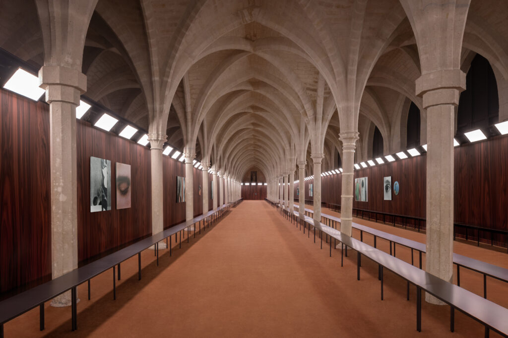 The next day, beneath vaulted Gothic ceilings, Silano’s sought balance disclosed itself in full. Inside the Gothic arches of the former monastery, Acne Studios conjured a smoky cigar salon for its Paris runway. It was an atmosphere steeped in contradictions: sacred yet carnal, restricted yet vulnerable. Silano’s images, created from repurposed queer archives, became the emotional heartbeat weaving through the show.