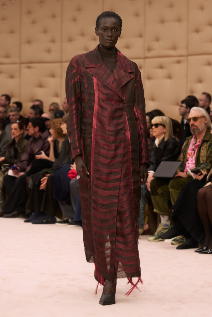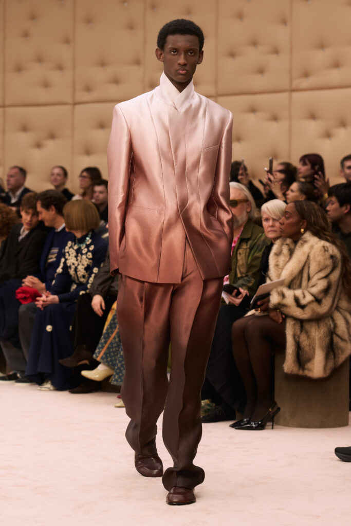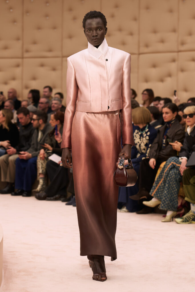 The runway was sleek and minimalist. Models walked around a pool of water, building on a message of fluidity in design. “The vision comes to life in an enveloping environment, suspended in a dimension of physical and mental well-being, in which water is a central presence: a link between self-care and the possibility of change, a fluid that unites the self and others, and transforms,” Ferrari said in a statement.