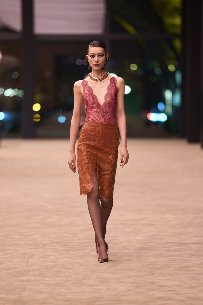 Vaccarello distilled the emotional intensity of each text into material contrasts: lace lacquered with latex, its delicacy held taut, pulled into alignment with a discipline similar to tailoring. Accompanied by sucubus slips harnessed at the womb by a strapy leather belt, reminding us that sex isn’t back; it’s forever.