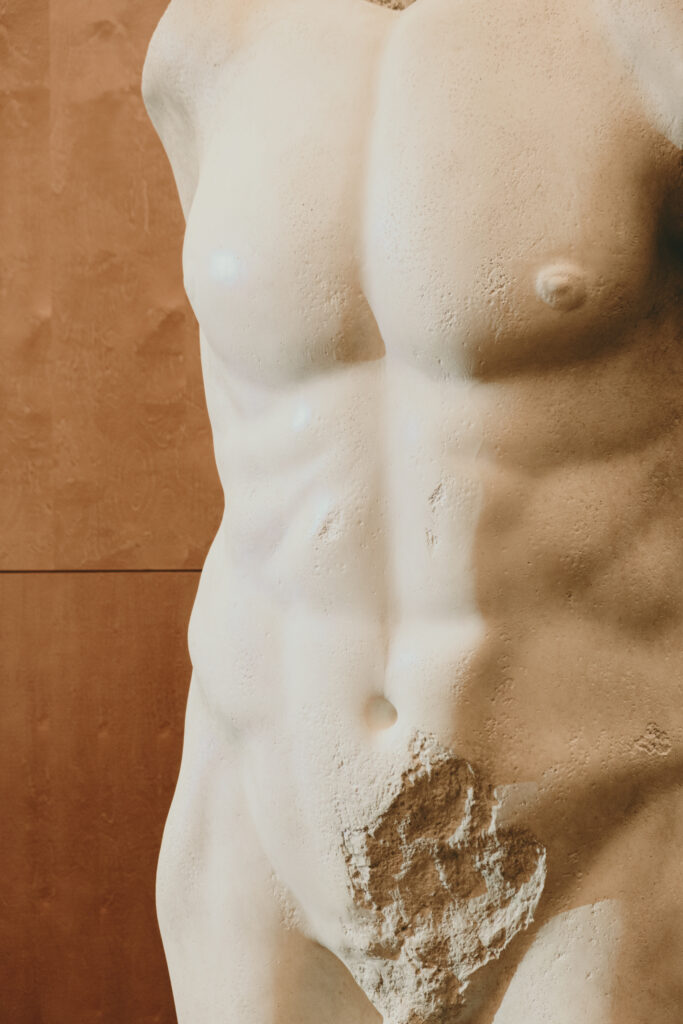 The show opened with eight bare-chested trouser suits, their structure was softened only by skin. The lapels climbed high and close to the neck, framing the face before plunging into sharply cinched waists. Shoulders were exacting, trousers elongated and fluid, flaring androgyny and undeniably sensual