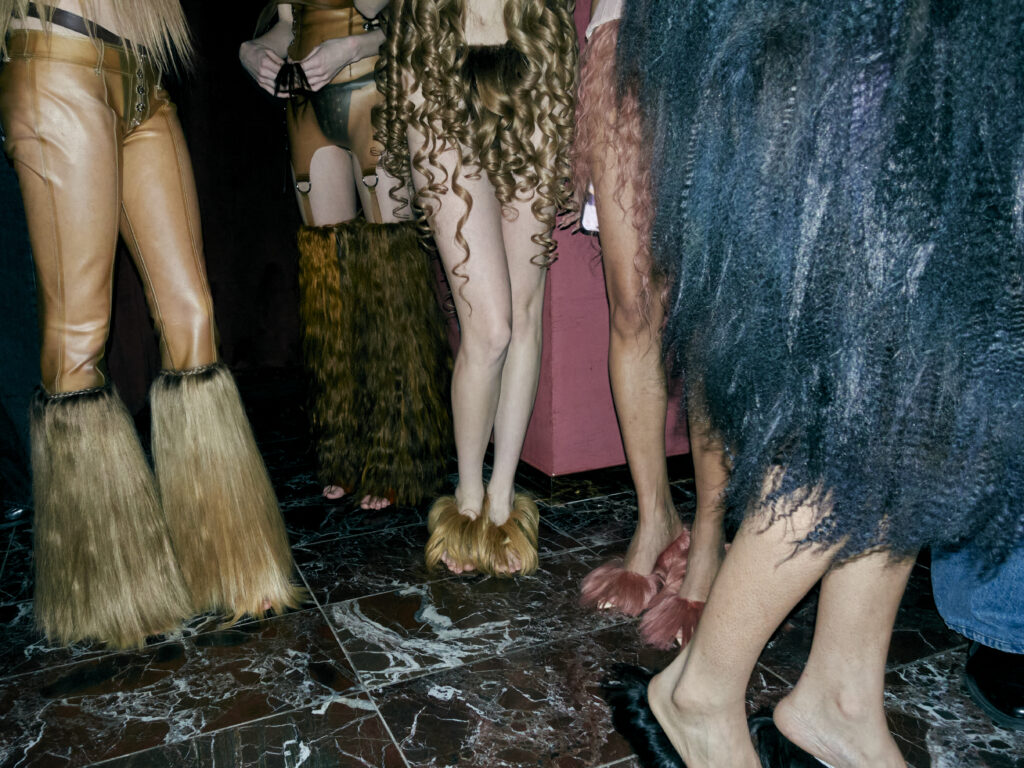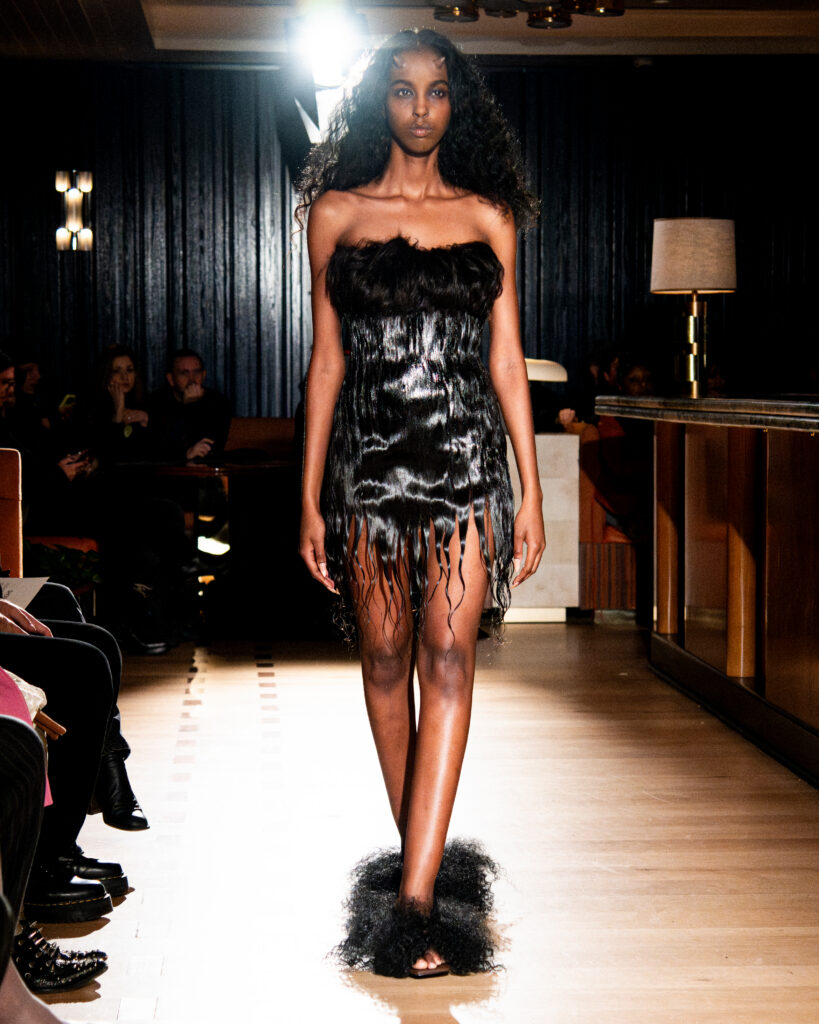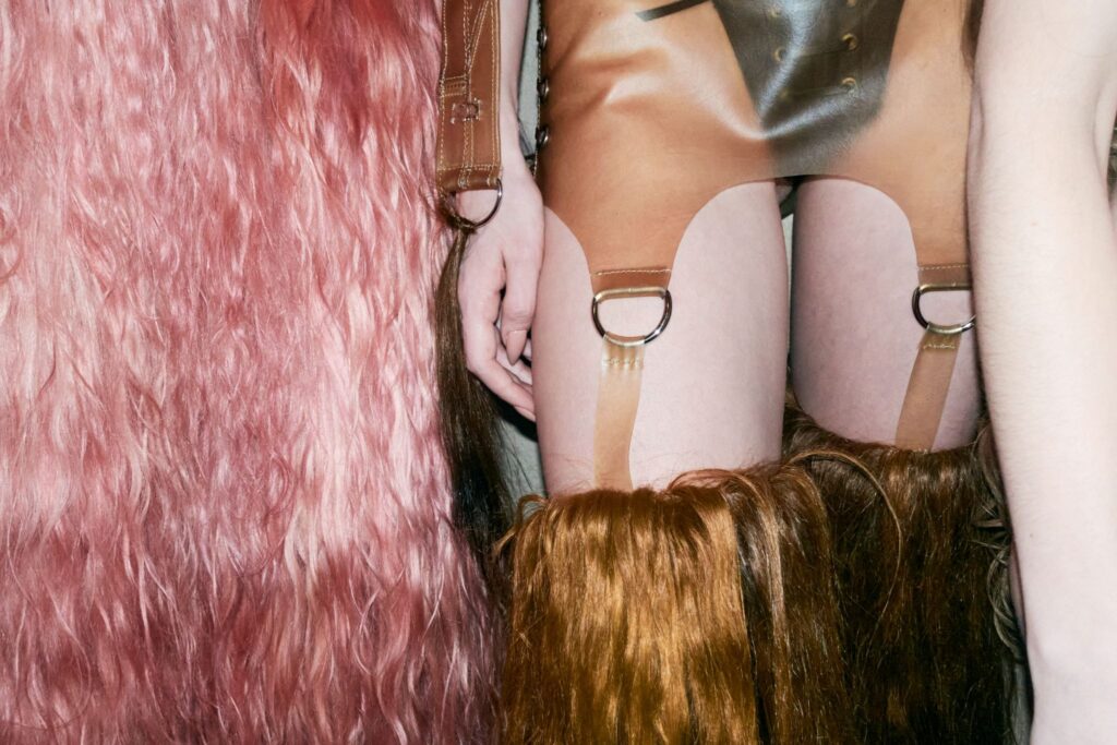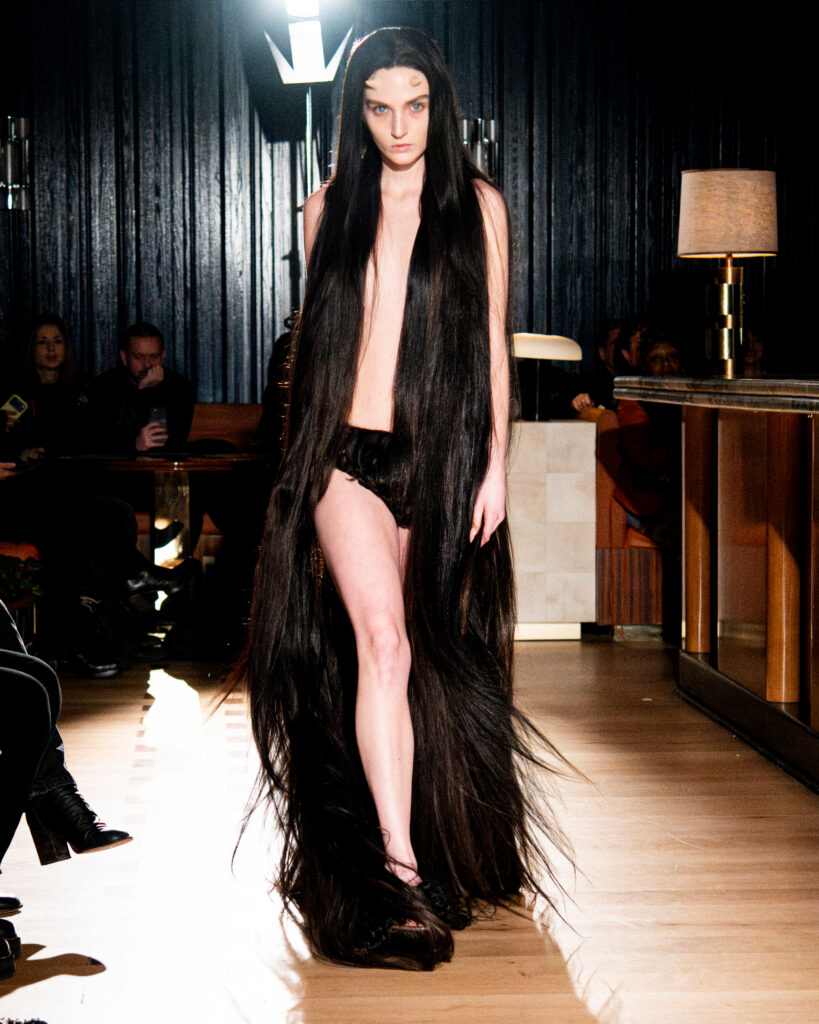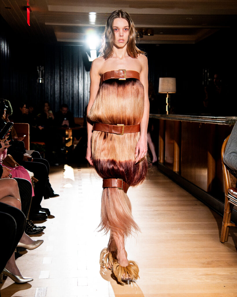 The collection is a metamorphosis in shape, color, and texture. The hair-embedded looks have strands that grow out long as well as bluntly cut short “hems” in other instances. Hair is always the main event, with only leather accents being used to shape and emphasize silhouettes that almost feel like a horse’s saddle — great foreshadowing for German DJ Horsegiirl’s closing moment.