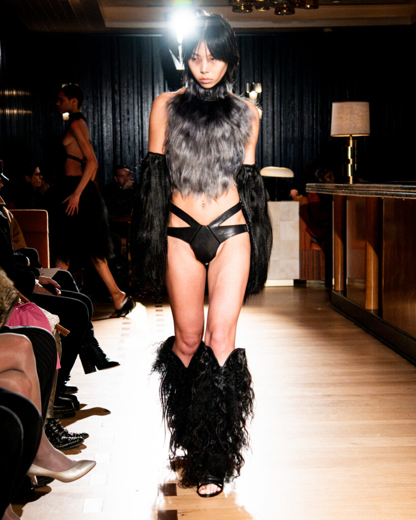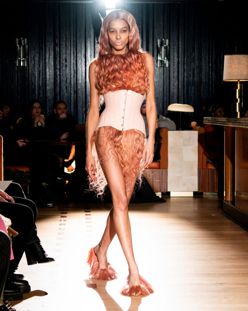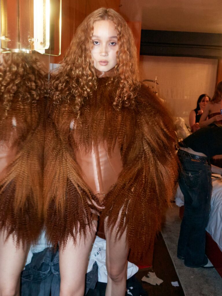 As a shorter presentation in contrast to other brands presenting during NYFW, there’s clearly a high level of curation in Showpony’s FW26 collection. Not a hair is out of place, even as waves and crimps add an unruly and fur-like texture to the long strands of hair decorating tops, skirts, and even boots. The colorful looks in shades of coral, maroon, and light gray are accomplished thanks to Pravana hair dye.