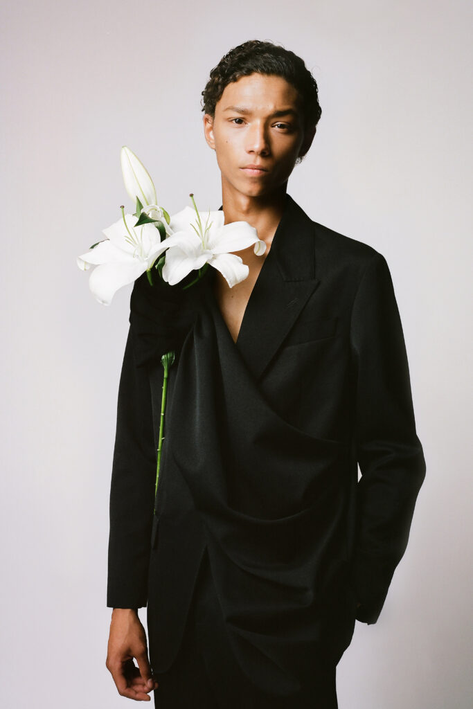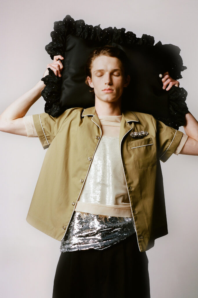 After debuting ten menswear looks at her runway show last month, Simone Rocha presents her full menswear collection for Spring/Summer 2026. For Rocha’s quirky take on a man’s wardrobe, the collection presents the man as a counterpart of the woman. He is the beau to her darling, and his clothes demonstrate just that. Rocha unites romance with a playful cheekiness, and streams a touch of naïveté throughout the collection, generating ironically elegant and earnestly delicate looks.