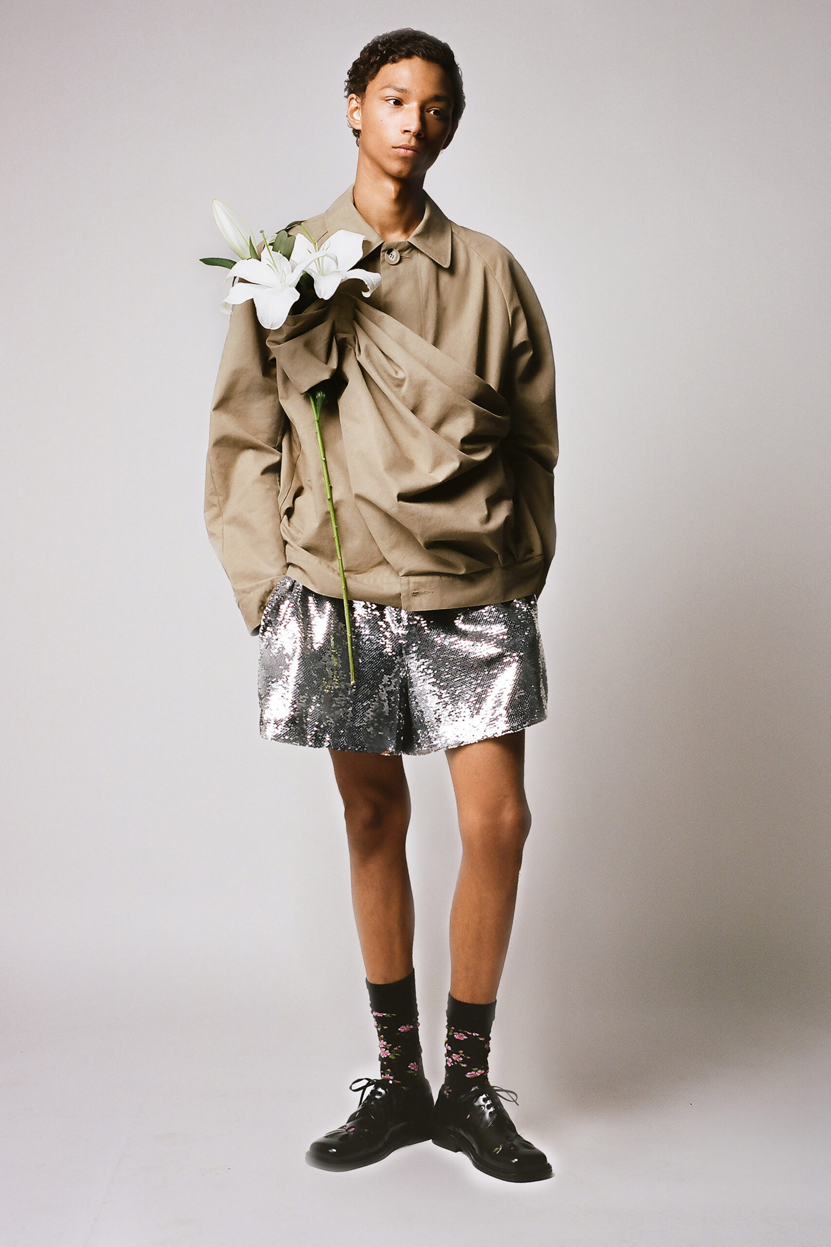 Adorned with a pleated sash travelling across the torso, a black tuxedo jacket and traditional trench, in both beige and red jacquard, are fit with loops to fasten a flower stem to. Polos and pullovers are enhanced with layered ruffles, while bowling shirts replace customary embroidered name-tags with glittering gem embellishments.