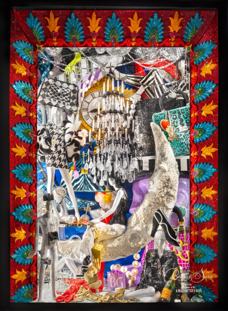 The women’s store presents five vivid scenes filled with color and motion. After Hours at Bergdorf’s: A Mad Hatters’ Bash imagines a whimsical nighttime takeover with sculptural hats, including one inspired by the store’s iconic chandelier. Masquerade Gala envelops its central figure with intricate paper elements that honor creative trades, while the women’s Game Night blends animals and games into surreal arrangements. Holiday Glow Up channels the energy of a neon-lit block party, and New Year’s Eve Countdown shimmers with crystals, clocks and mirrored details that capture the final moments of the year. The looks showcase designers such as Christopher John Rogers, Brandon Maxwell, Marc Jacobs, Balmain, Valentino, Altuzarra, Zomer and Givenchy.