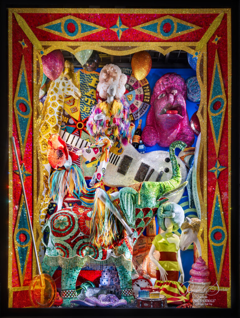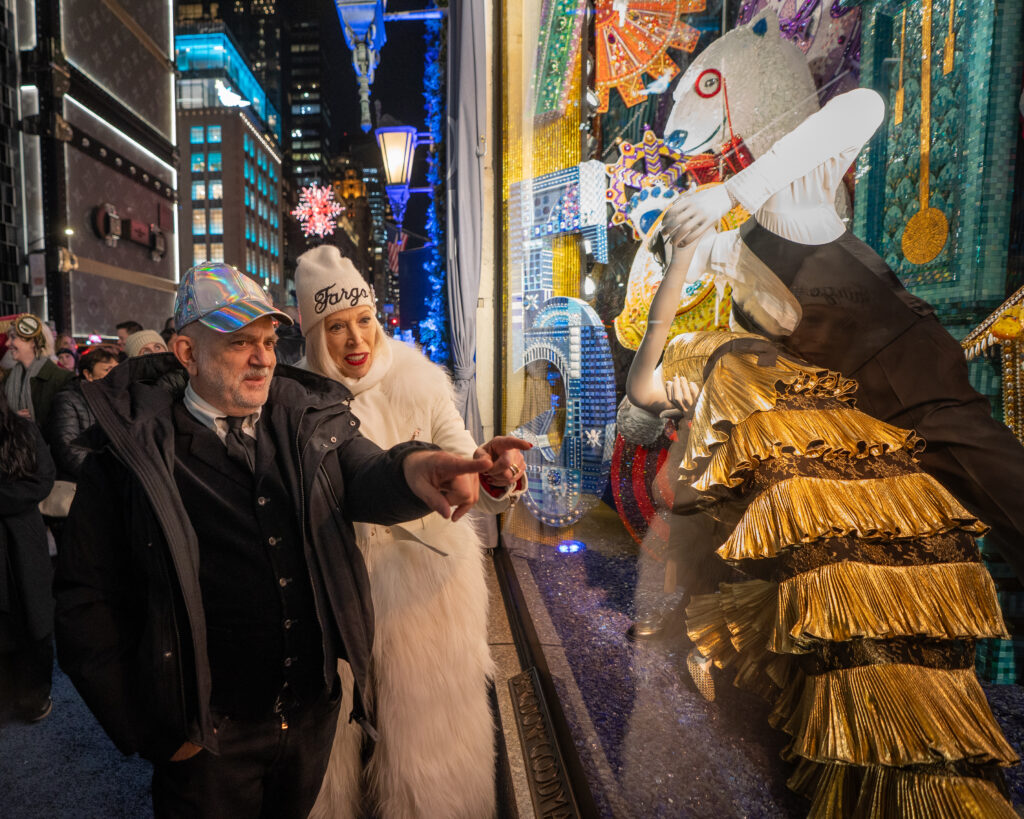 Across the avenue, the men’s windows provide a counterpoint in a refined black-and-white palette. A Frozen Fête resembles a soft-sculpture winter banquet, while Surprise Party plays with anticipation through a split-scene design. The men’s Game Night offers a spirited nod to sport, and House Party highlights meticulous handcrafted detail. Styling features pieces from Tom Ford, Dries van Noten, Rick Owens, Willy Chavarria, Fendi, Bottega Veneta and other leading menswear houses.