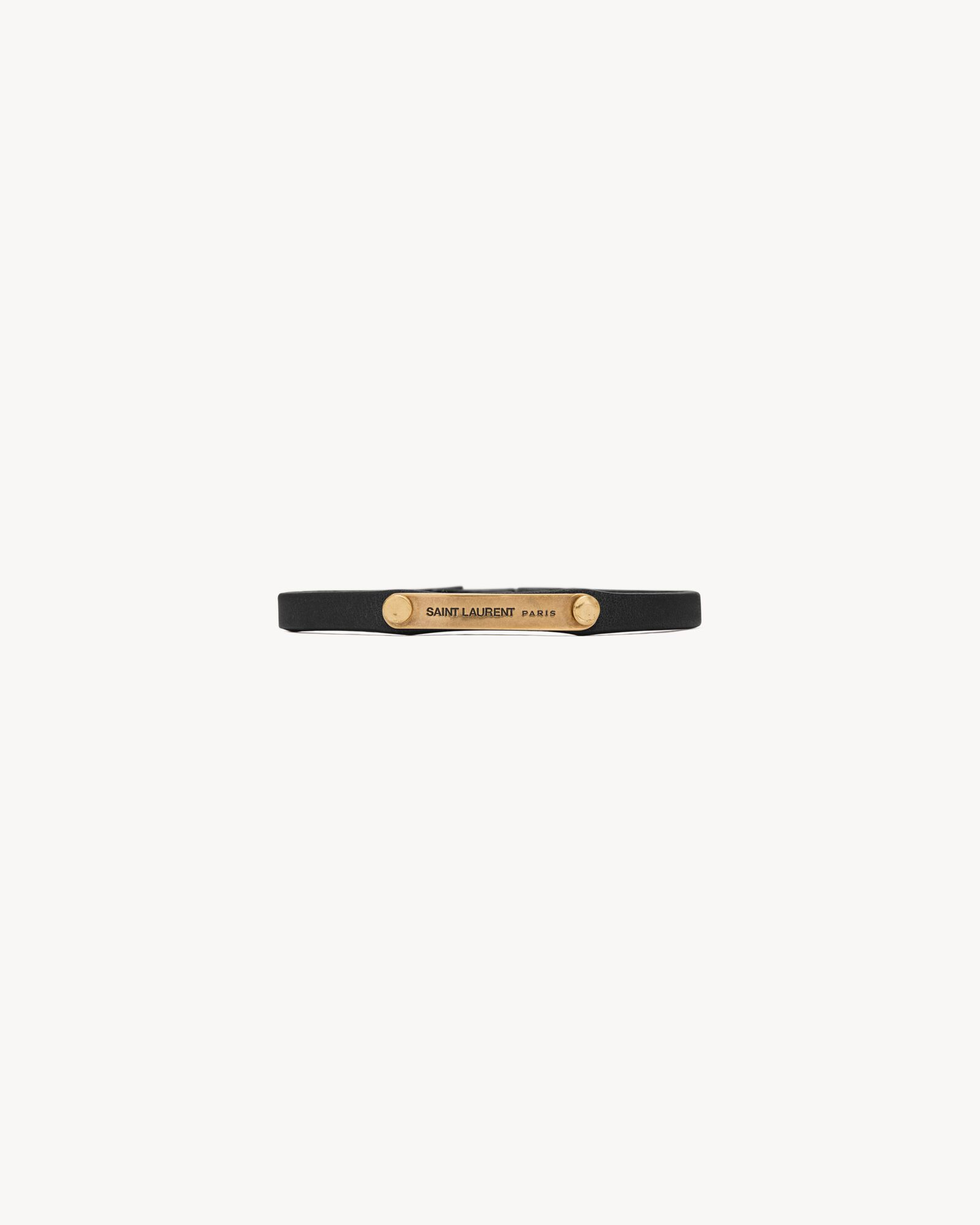 For a simple yet effective way to incorporate jewelry into your outfit, there’s no going wrong with a leather bracelet. Made of 100% calfskin leather, this smooth leather band features a metal plaque engraved with the Saint Laurent logo, the juxtaposition between earthy and opulent.