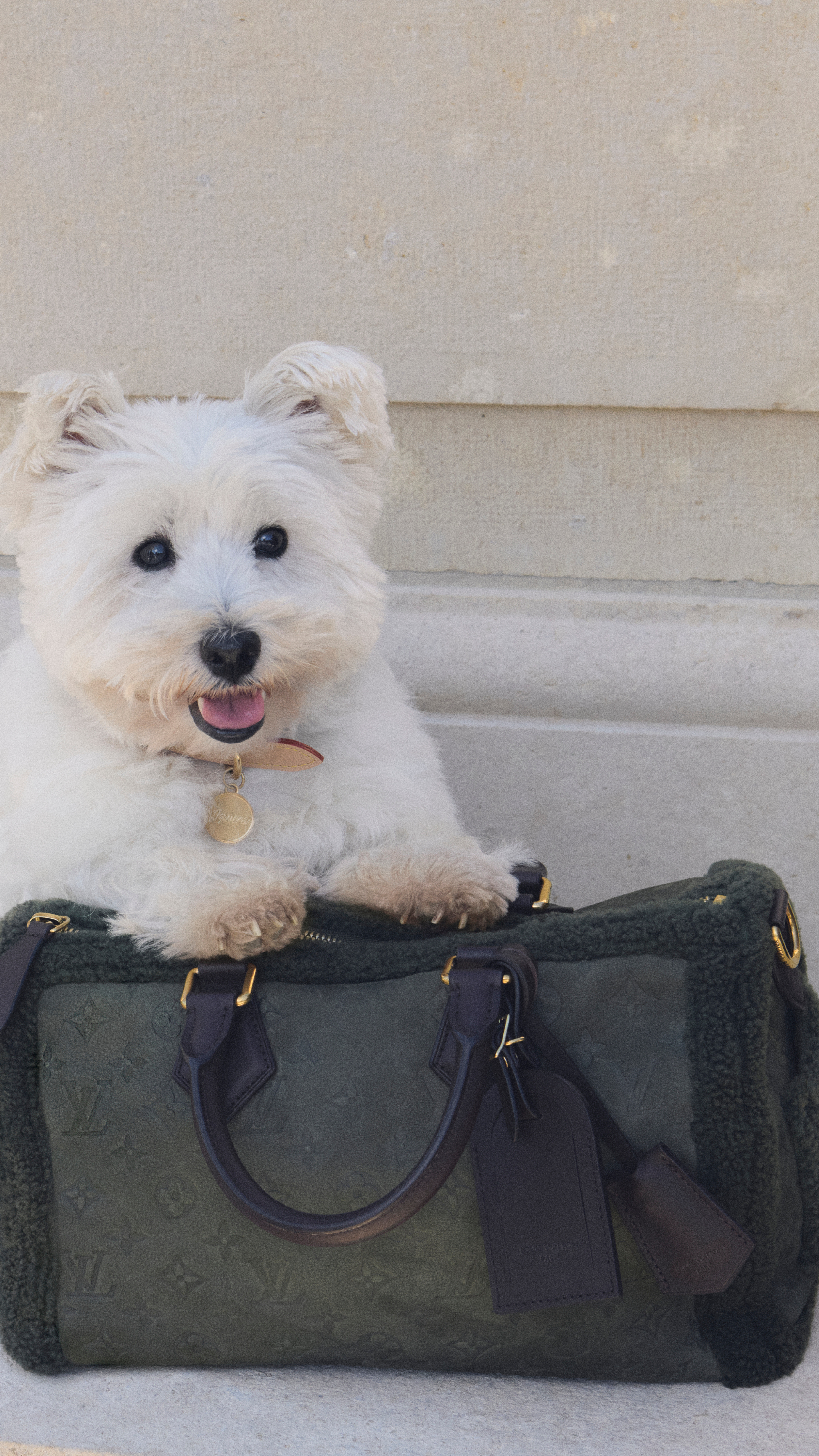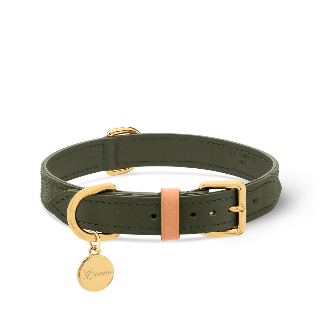 The collection also allows for dog and owner outfit coordination; a leather crossbody thermos holder matches the leather-covered water bowl. Many items qualify for Louis Vuitton’s personalization service—a looped leather leash handle or the inside of a leather Monogram collar may be hot-stamped with a dog’s name, and Monogram canvas clip-on cleanup bag dispensers come with optional Shiba Inu, Beagle, and Bulldog personalization.