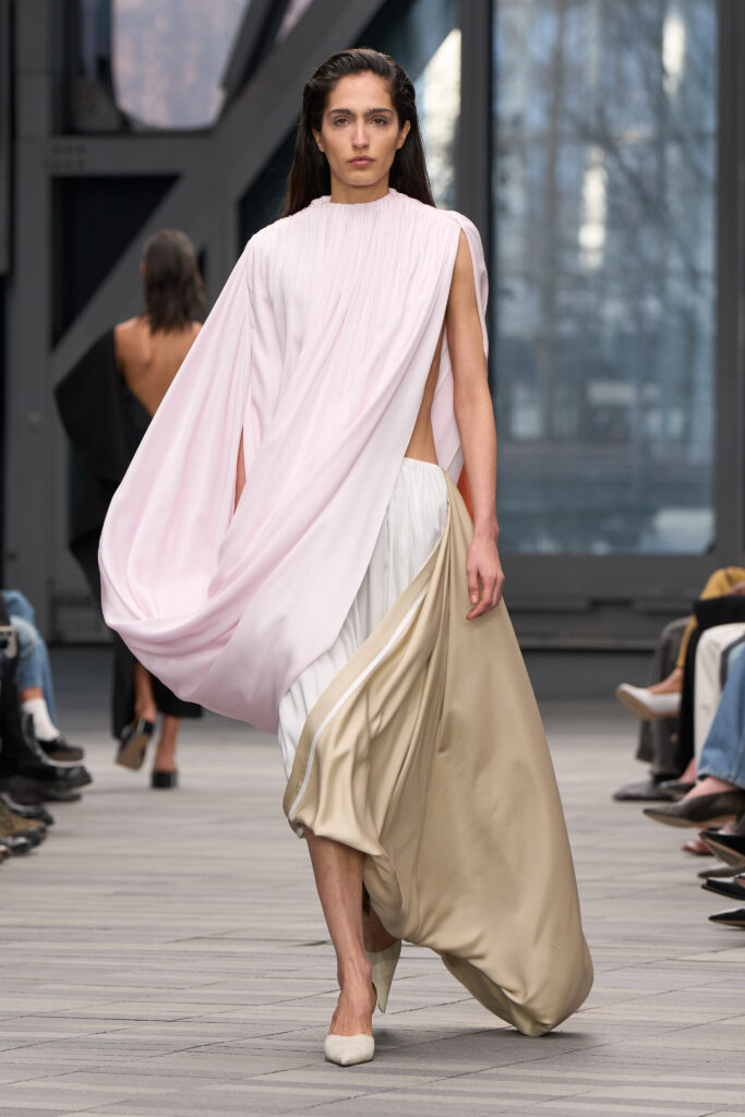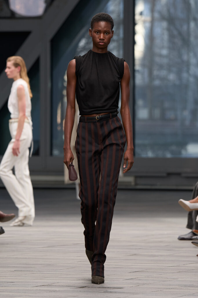 Color remained largely subdued, forming a landscape of neutrals occasionally enhanced by tangerine or burgundy. From dry tailoring wools and ribbed jersey to bonded satin, liquid velvet, grosgrain, and both opaque and transparent leathers, the materials created variation without relying on embellishment.