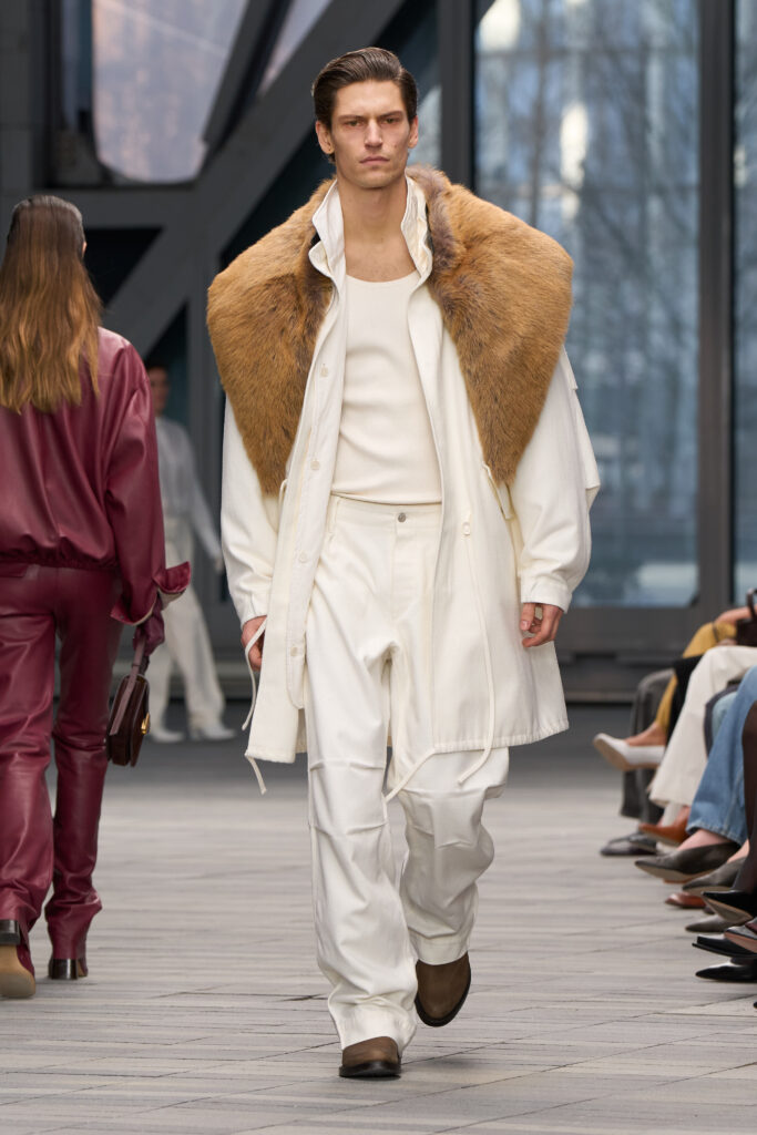 This engagement with the archive served as a way of measuring the present collection against the principles that originally shaped the label. Collars emerged as one of the collection’s few expressive devices. White collars sharpened the neckline, biker collars added abrasion, and shearling shifted from trim to full outerwear, expanding proportion while maintaining the collection’s sensibility.
