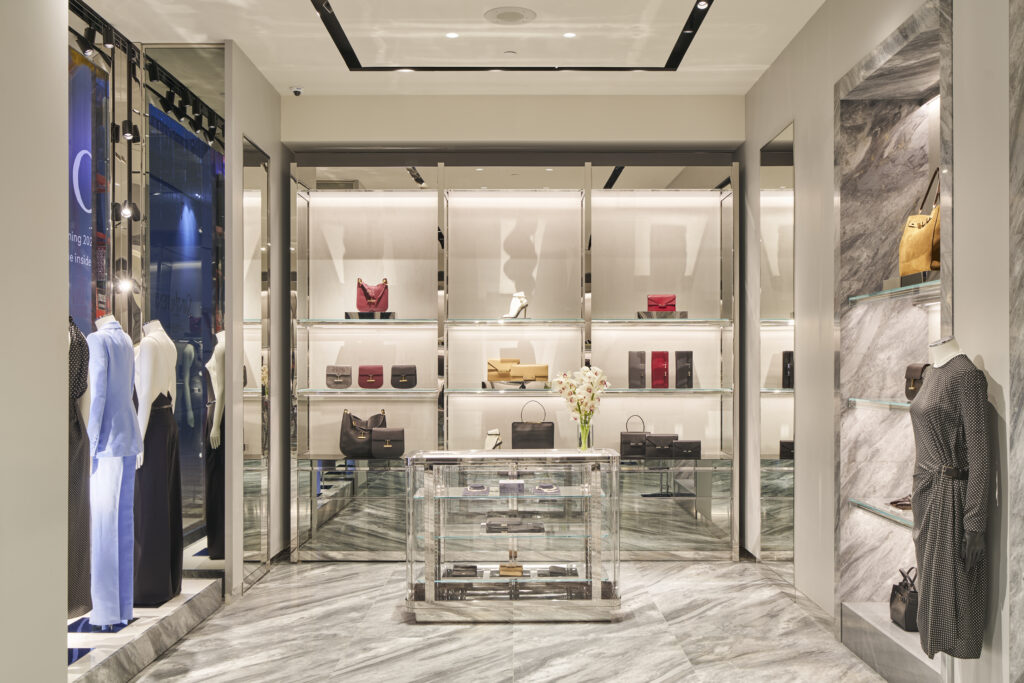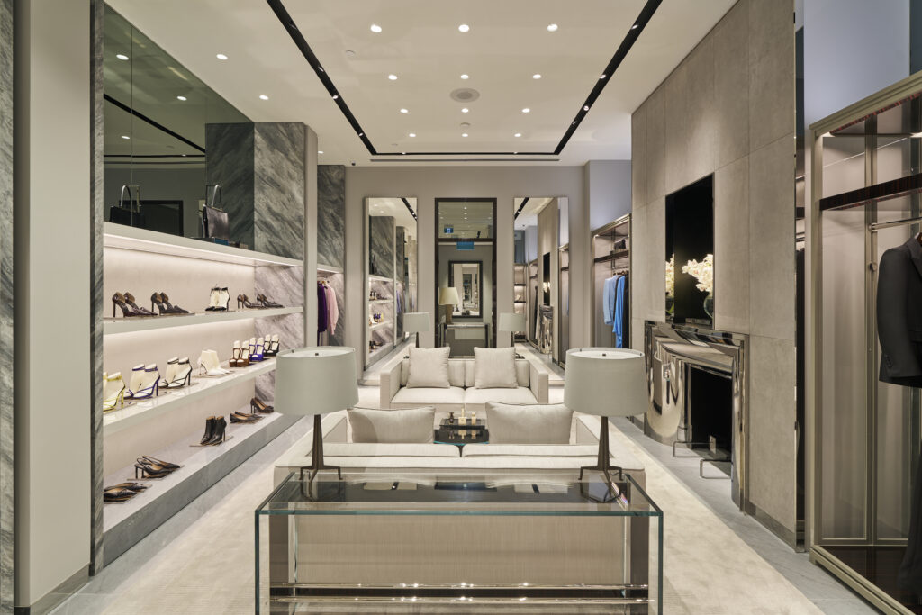 Inspired by the TOM FORD Madison Avenue flagship store in New York City, the interior of the new boutique adheres to the brand’s signature palette of greys and deep browns, along with chrome and glass features, producing a distinctly TOM FORD atmosphere. With sleek, clean lines of chrome and refined display cabinets crafted in Cala Paonazzo marble and Macassar ebony, the finished interior evokes the epitome of luxury. Partitioned walls create discreet areas for clients to shop in privacy and comfort, accentuating the air of exclusivity in the space.