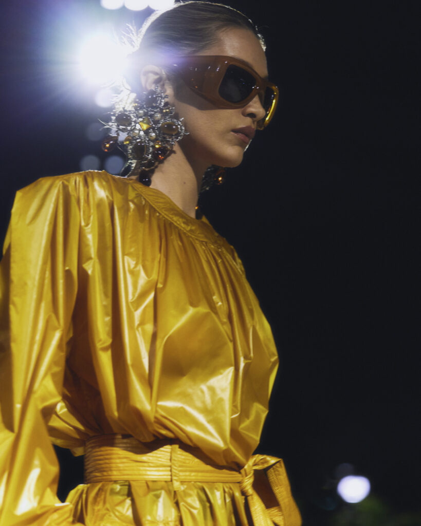 This Parisian fashion week debuted not only a fresh collection of Vaccarello’s finest, but also a triumphant return to the runway from Bella Hadid, wearing a gilded, translucent coat dress, bejeweled drop earrings, and large brown frames.