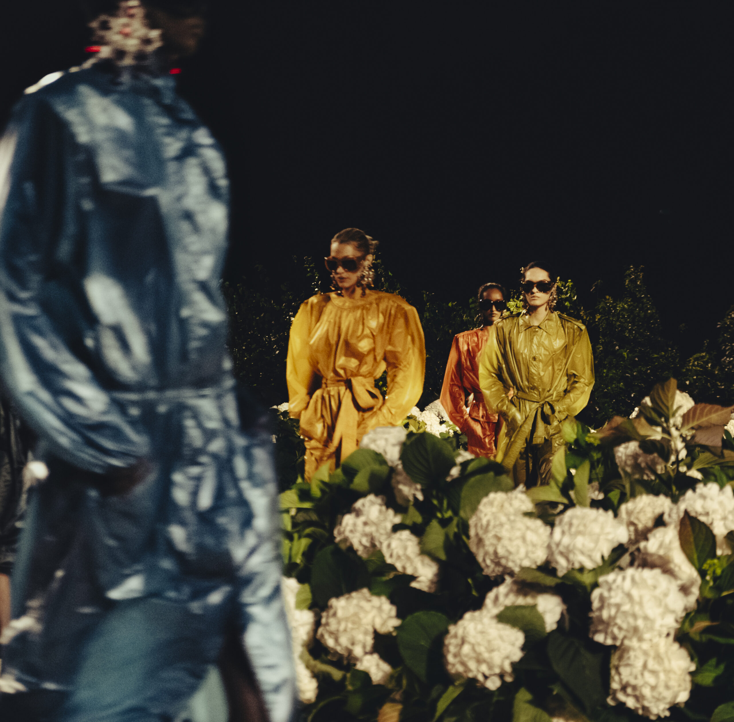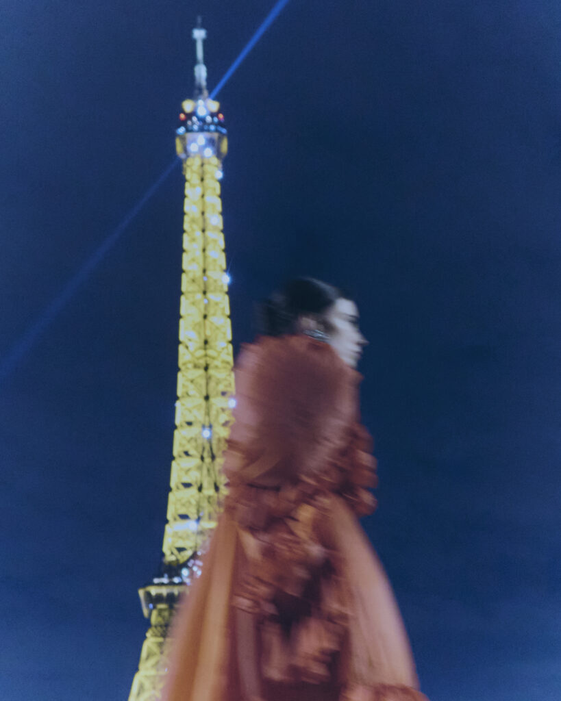 Though the Eiffel Tower was quite the sight, opulent white hydrangeas adorned the runway’s hedge centerpiece, forming the Cassandre “YSL” logo when viewed from above—the set epitomized French chic.