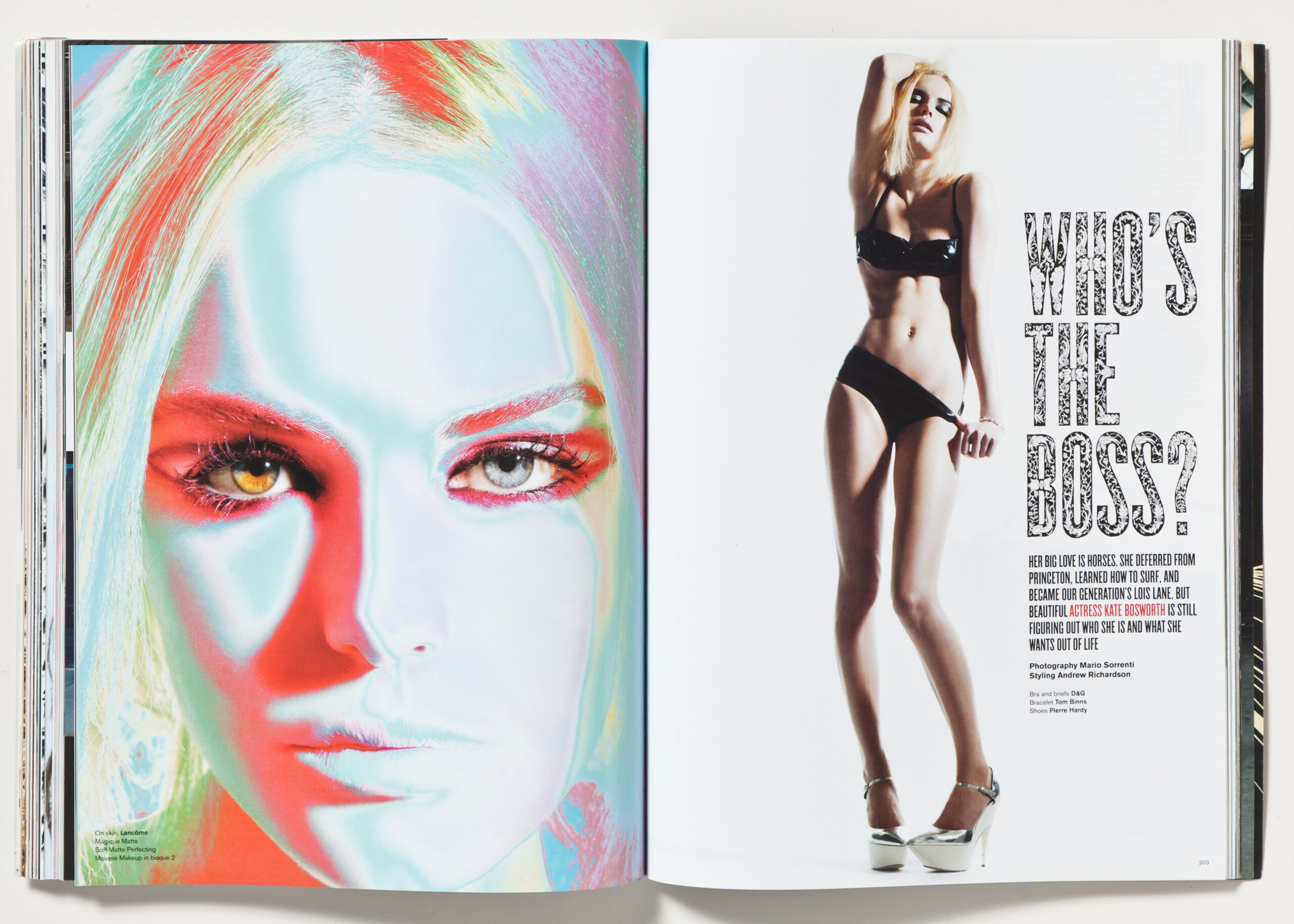It turns out, however, that Kate’s ability to work the whole spectrum has had its upside. Take her film career: her first role was as Scarlett Johansson’s best friend in 1998’s The Horse Whisperer, followed up by smaller films, including 2002’s Blue Crush, the star-making vehicle about a Hawaiian surfing threesome led by the blonde, bikinied Bosworth. Last year she ventured to blockbuster territory, taking the role of Lois Lane in the $200 million Superman remake. But, just as it looked like she was ready to sell her indie cred for marquee status, she wrapped another small film this year (“it was more a labor of love,” she says) with Sigourney Weaver, The Girl in the Park, by the writer of the Broadway play Proof.