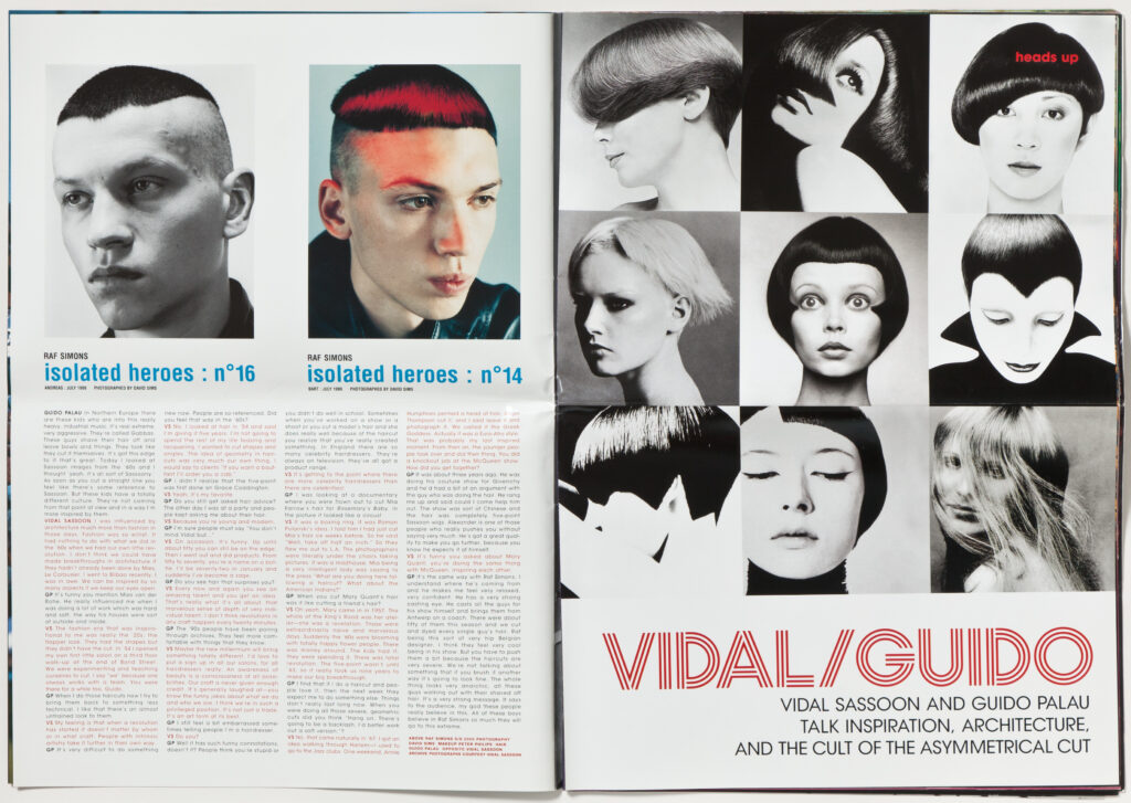 GUIDO PALAU: In Northern Europe there are these kids who are into this really heavy, industrial music. It’s real extreme, very aggressive. They’re called Gabbas. These guys shave their hair off and leave bowls and things. They look like they cut it themselves. It’s got this edge to it that’s great. Today I looked at Sassoon images from the ’60s and I thought yeah, it’s all sort of Sassoon-y. As soon as you cut a straight line you feel like there’s some reference to Sassoon. But these kids have a totally different culture. They’re not coming from that point of view and in a way I’m more inspired by them.