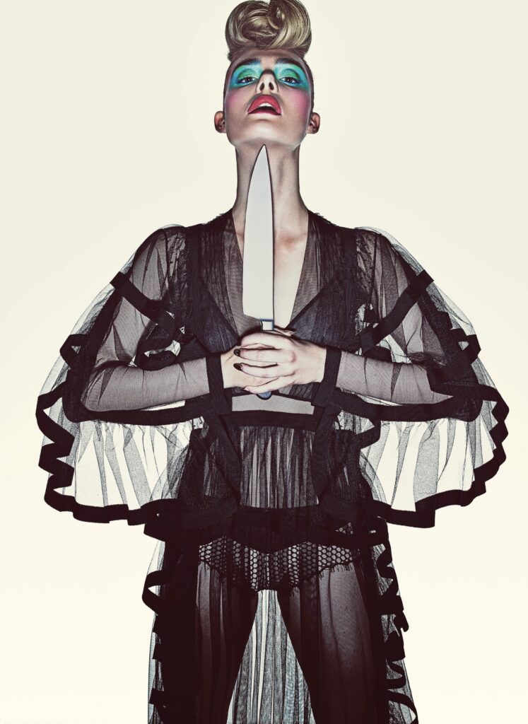 Maybe his love of genres cooked up in Hollywood comes across more unequivocally. While Drive was hailed as a neo-noir, Demon has been called a psychological thriller, and even “horror.” “I’ve always wanted to do a teenage horror movie,” Refn says, “but possibly without the horror. lithink there’s a 16-year-old girl in every man. I’d always wanted to fantasize what it’d be like to be a beautiful girl. Innocence- and virginity- is a great analysis of genre. And then moving into the big city, it’s always very frightening, especially when it’s L.A., because L.A. is such a mysterious place.