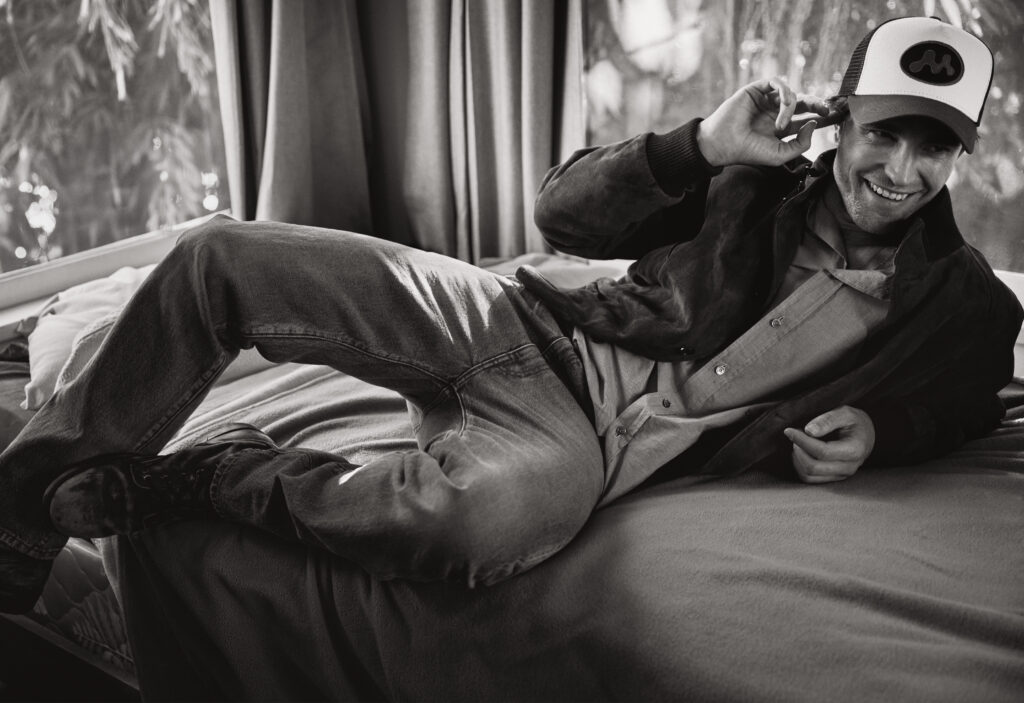 Robert wears suede jacket and cotton shirt DIOR Jeans RE/DONE / Trucker hat MOWALOLA / Necklaces talent’s own / Boots stylist’s own