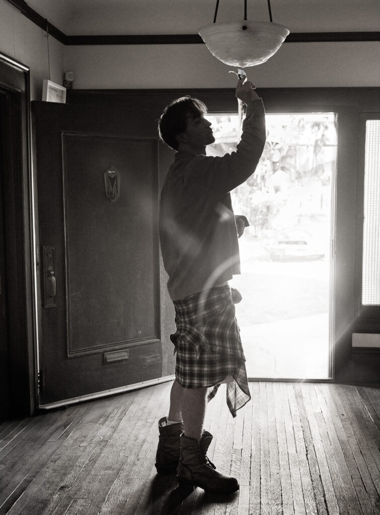 Robert wears panelled overshirt ADON / Plaid shirt (around waist) ERL / Cargo shorts DIOR / Necklaces talent’s own Socks and boots stylist’s own