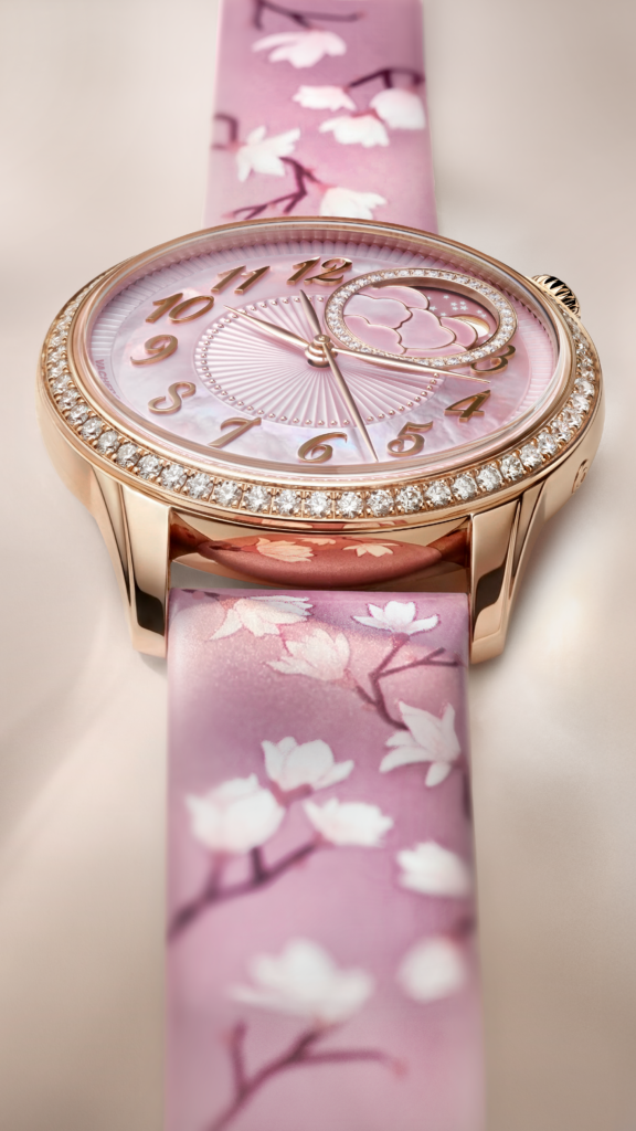Soft pinks, painted blossoms, and moonstone contribute a sense of natural artistry to the timepiece. A circle of diamonds also sits between 1 and 3 o’clock. Tonal variations in the mother-of-pearl and hand-painting allow for subtle variations in each of the 100 numbered watches.