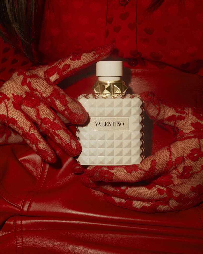 In addition to fragrance, the collection includes Spike Valentino Ivory lipstick in four shades: neutral nude, warm pink toffee, terrazzo red and a rose-gold shimmer topper. Each contains Roma Light Complex—the brand’s light-reflecting pearls for luminosity—and delivers a matte finish.