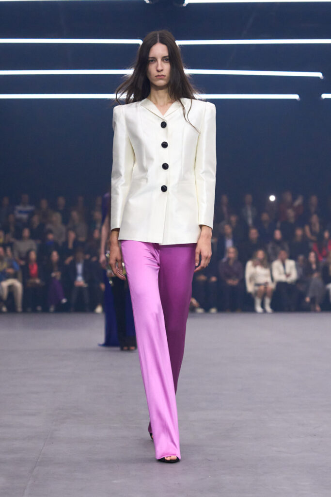 Michele incorporated lace, patterns, and tailoring into his array of colors, which transitioned from bold colors such as fuchsia and chartreuse to quiet neutral tones, such as smoke and ivory. Shoulder pads, pinstripe suits, bows, rouched silk, and balloon sleeves all added to the vintage appeal of this collection.