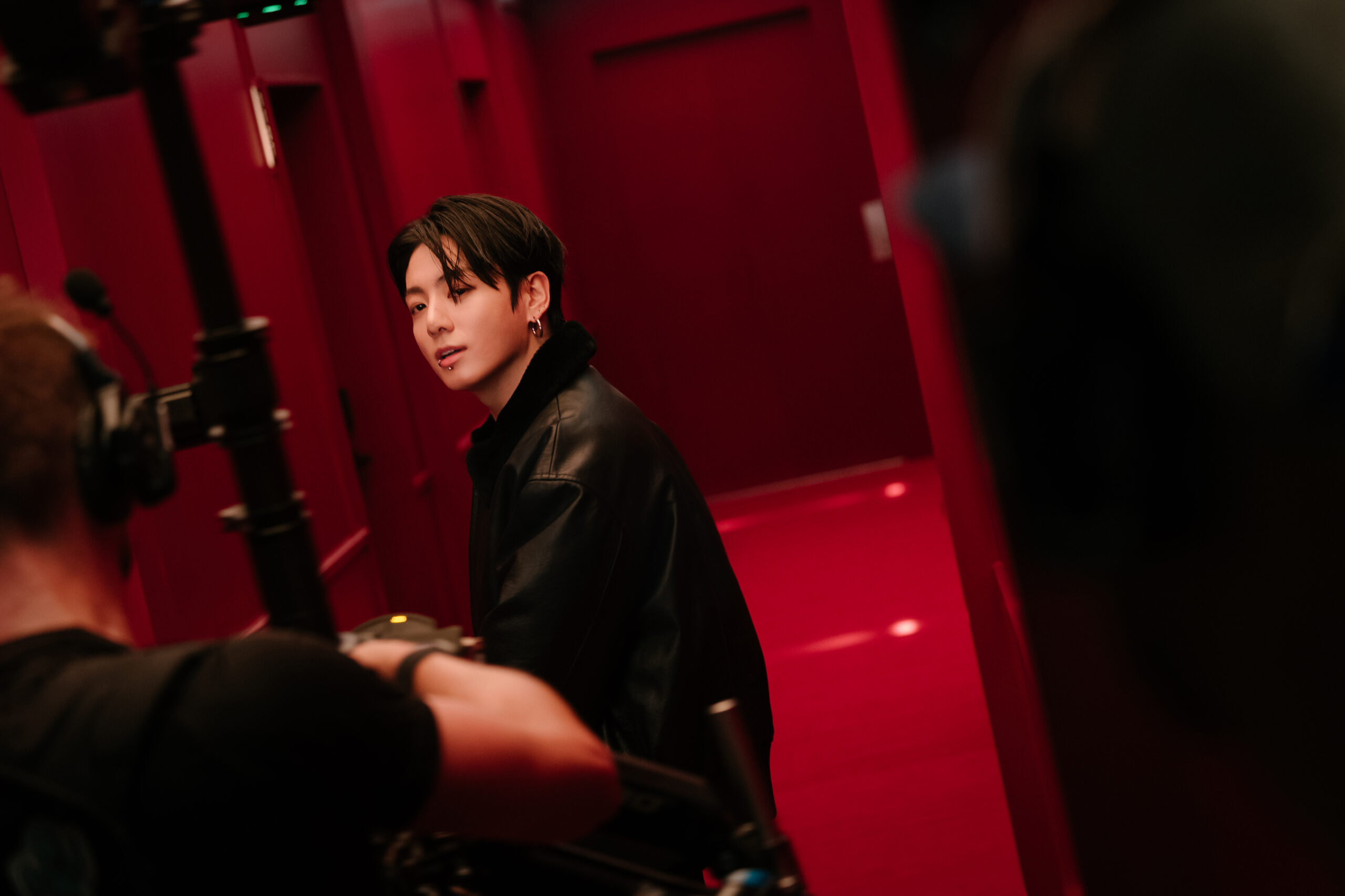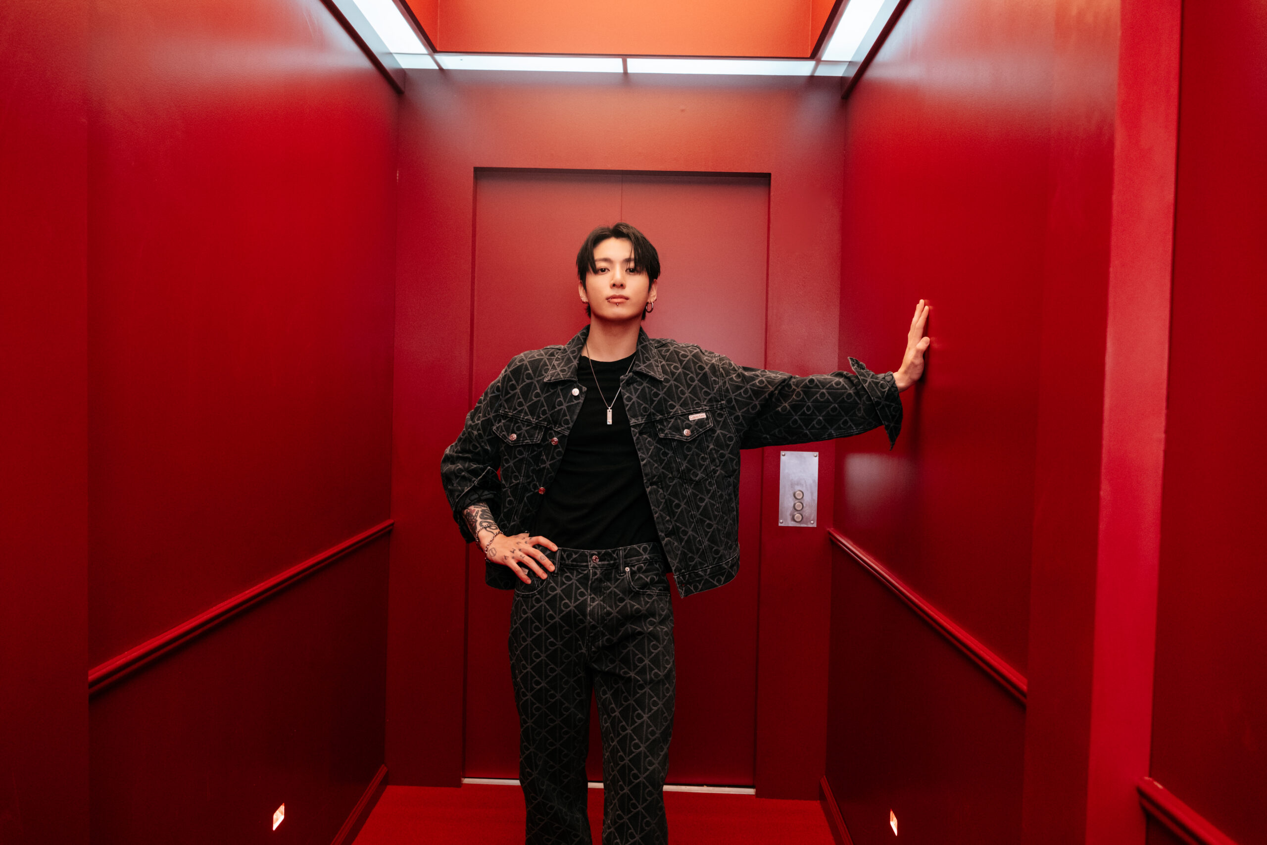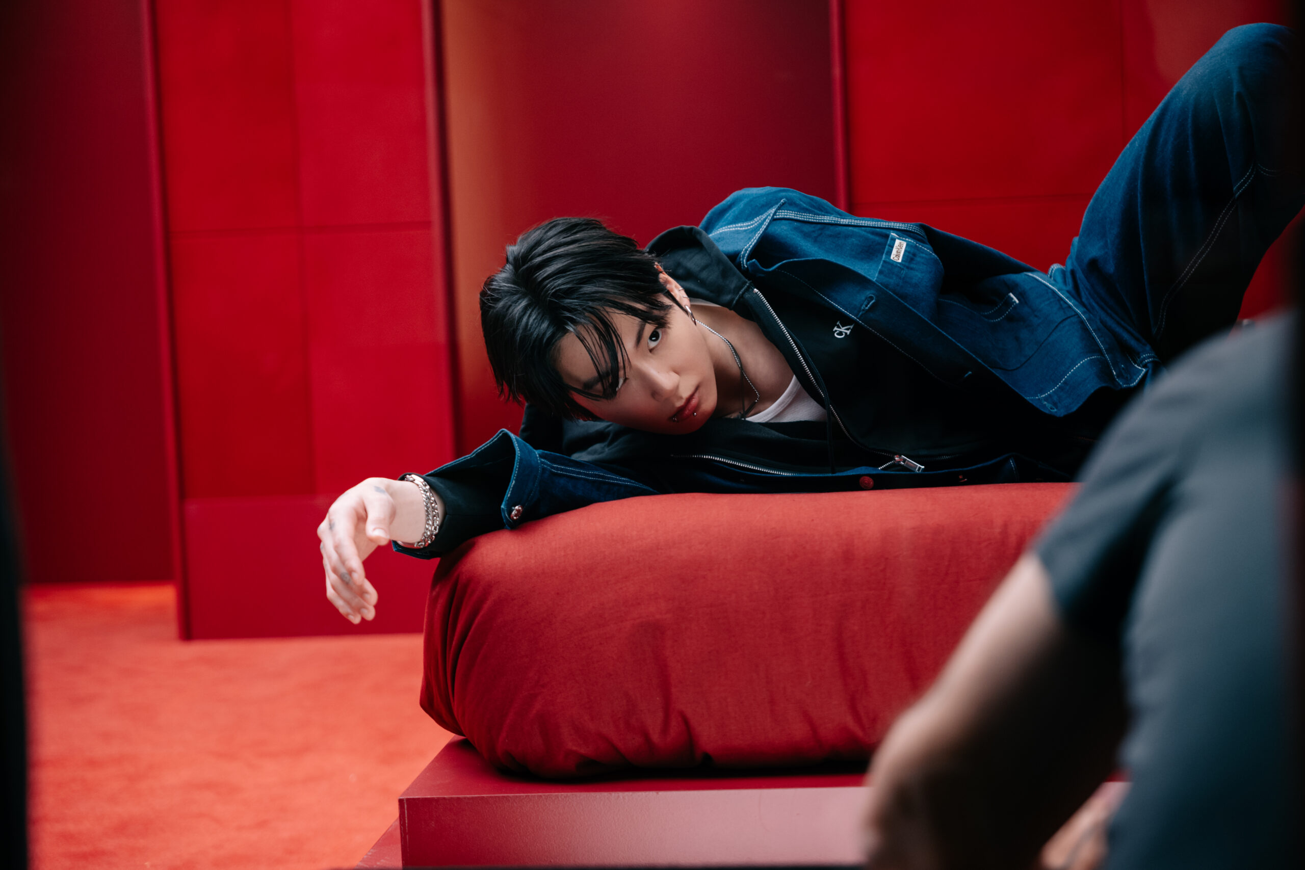 The red walls, the low light, the quiet before the flash. What you’re seeing here isn’t part of the official campaign; it’s what happens in between. These exclusive behind-the-scenes images and video for VMAN from Jung Kook’s latest Calvin Klein shoot capture the global sensation’s energy in its purest form, head to toe in CK, wrapped in leather, denim, and confidence.
