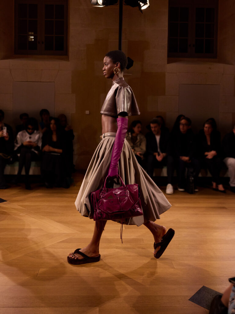 Still, nodding to Demna’s reign, bug-eyed glasses graze the first look of the Summer 2026 collection, accessorizing a simplistic billowed black gown. Throughout, Piccioli highlights the relationship between the cloth and body, echoing the house’s emphasis on humanity—a crucial factor in the new leadership’s aesthetic. In a radical change, the house is now redefined with precision and less noise.