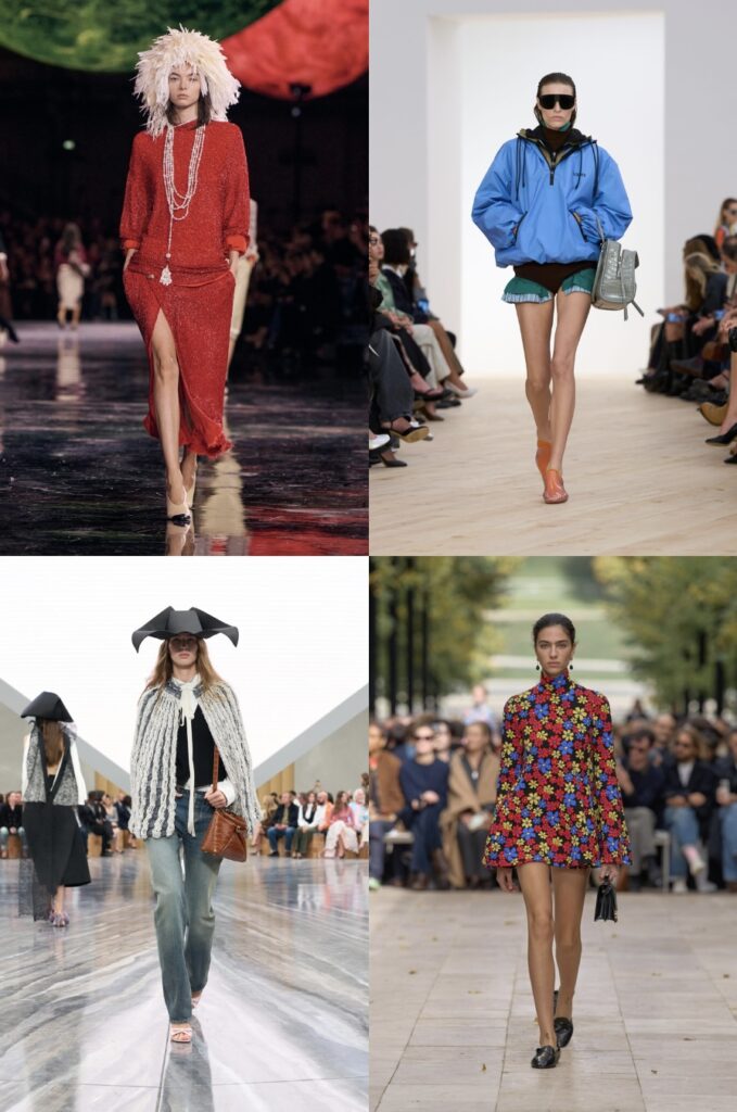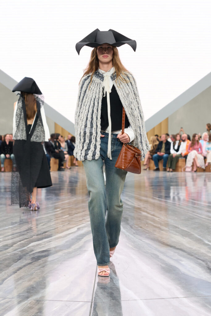 Back in Paris’ Grand Palais, a suspended solar system of gargantuan 3D glowing planets and a glazed galaxy floor decorates the runway. A refined, cropped blazer and twin low-rise pants introduce Chanel’s new era through subtle yet striking details—a micro houndstooth pattern, softened tailoring, and understated accessories that quietly redefine the house’s classic codes. Blazy’s Chanel girl can be immediately identified as refreshed and relaxed. Throughout the collection, tweed is torn, feathered, ripped, untethered, reinterpreted in unstructured silhouettes.