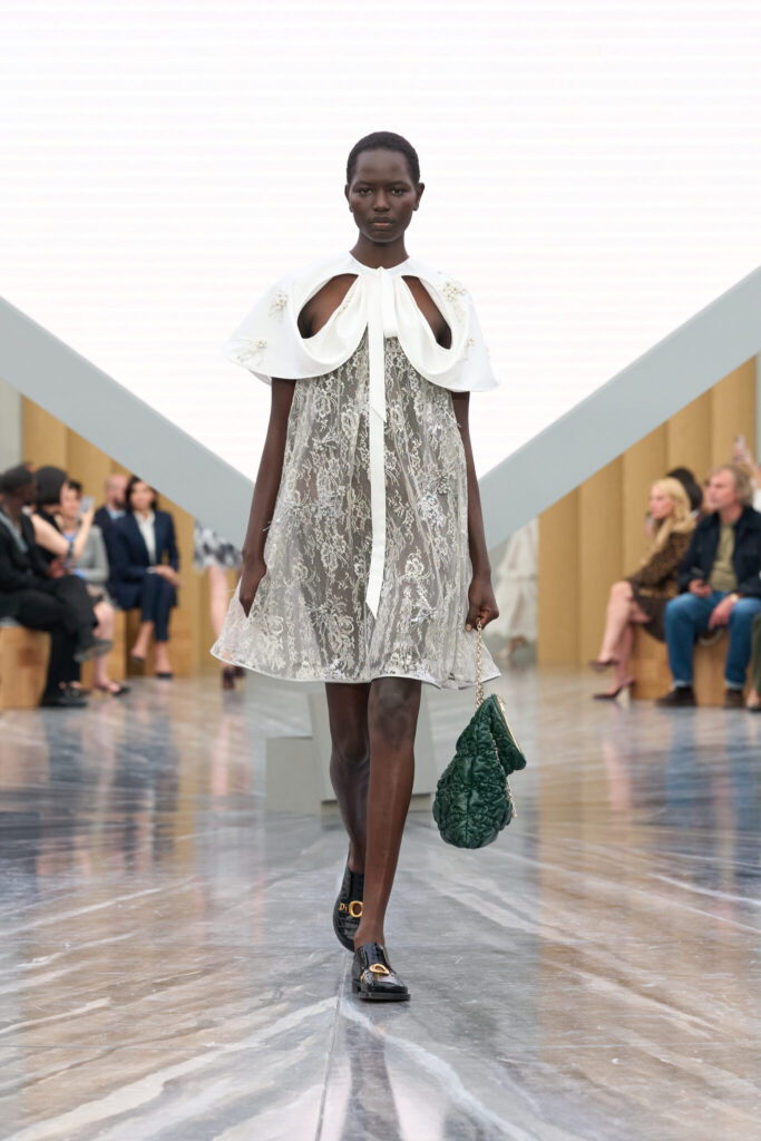 Circulating the ground floor of the maison’s Parisian HQ, the Spring/Summer 2026 collection is introduced by a palette of whites and écrus in various French fabrics—a blank slate for the new leadership. Texture remains central to Thomas’ design language. Mixtures of lace, silk, cotton voile, jacquard, and moiré fabrics define delicate and airy silhouettes, some apposed by a patent vinyl of black or cream. However, compared to the archives, the silhouettes bear more skin, executed with careful intention and mindfulness. Thomas maintains the maison’s heightened intimacy.