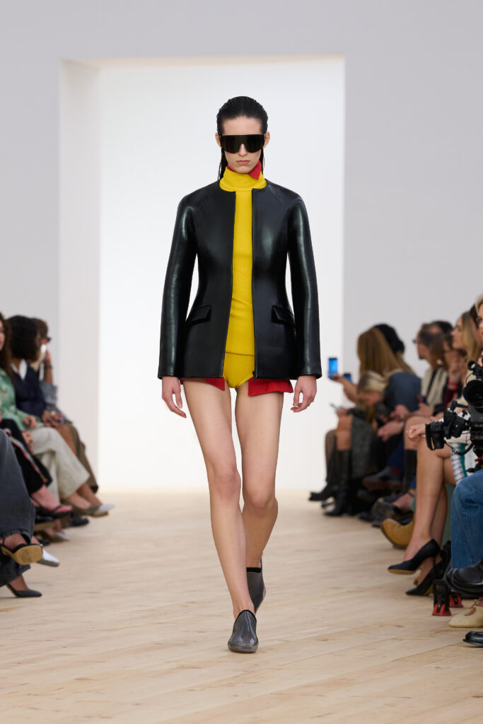 The Spring/Summer 2026 collection finessed a series of charming silhouettes that hint at the aesthetic of Loewe’s evolution. Notably, the pair experimented with garment molds, sculpting simple leather dresses, crinkled knit tees to float over the bodice, and coastal towel dresses. Undone button-ups were double, thrice, quadruple-layered, and peaked beneath micro-short briefs, while minimal matte leather trenches revealed a drawcord cinching of the back yoke. Anderson’s accessory-driven house legacy lives on—interchangeable low-cut socks lined silicone clear kitten heels, and a series of boxy single-handle purses were just a couple of standouts. Intensified by a seasonable color palette of purples, blues, yellows, and greens, Loewe’s direction ultimately feels refreshed by playful Spanish summer codes and characteristic technical craftsmanship.