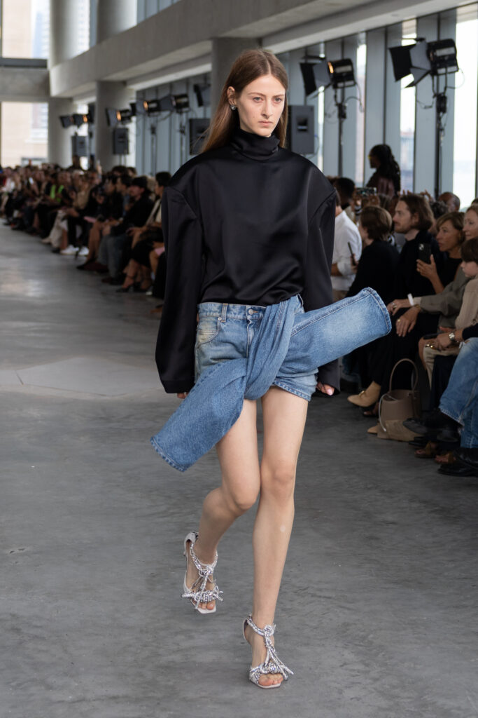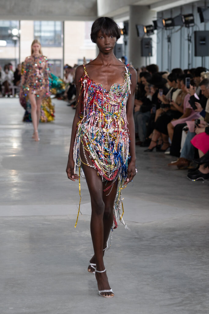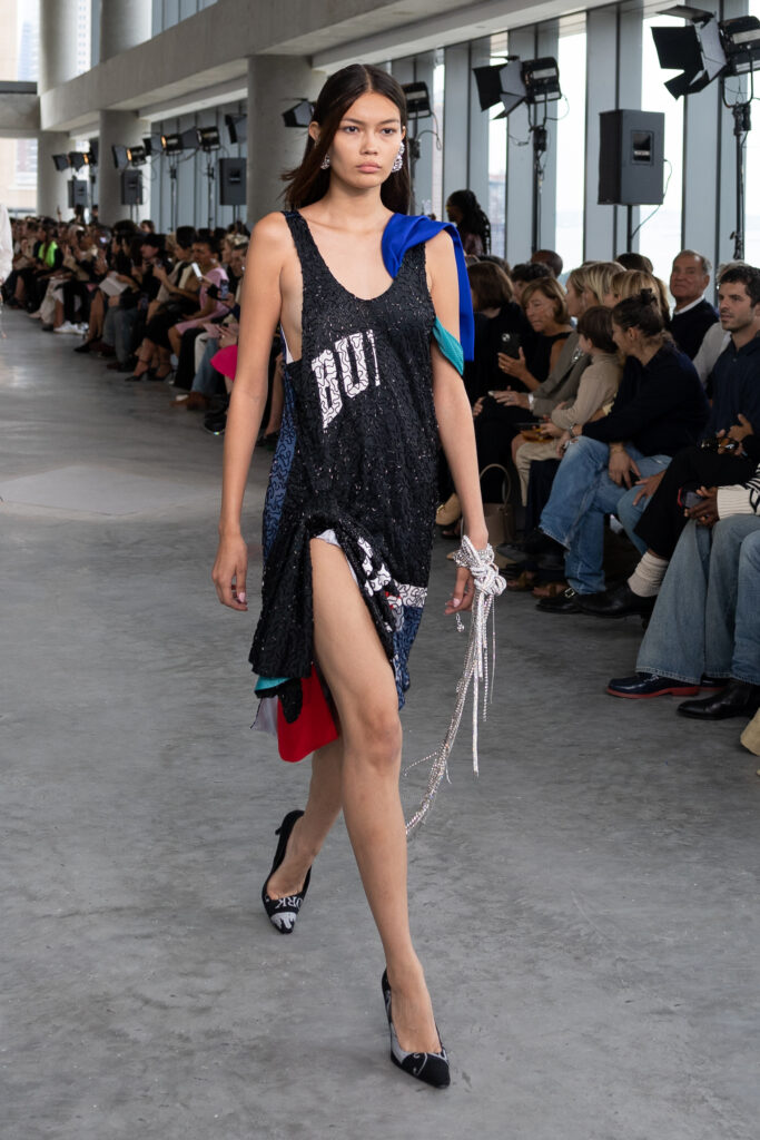 The new era of Area opens with an ode to “the party”—a reflection of the house’s history, New York’s nightlife, and celebrations of all kinds. Auburn’s Spring/Summer 2026 direction maintains Area’s revered, bejeweled aesthetic, while tying the house’s vision back to New York’s street vernacular. Jerseys transform into party dresses, and confetti becomes the gown through enlarged paillettes and reflective tinsel. Strung crystal-bead chains cascade into minis, and wrapped crystalized ribbons become evening gowns. Apposingly, unadorned, bare denim is manipulated to dramatize the typical jean silhouette—denim trousers are knotted to form a frontal bow on mini skirts, while other pieces utilize artful distressing. The garments transcend embellishment—the embellishments themselves become garments. Aburn’s debut proves his willingness to experiment.