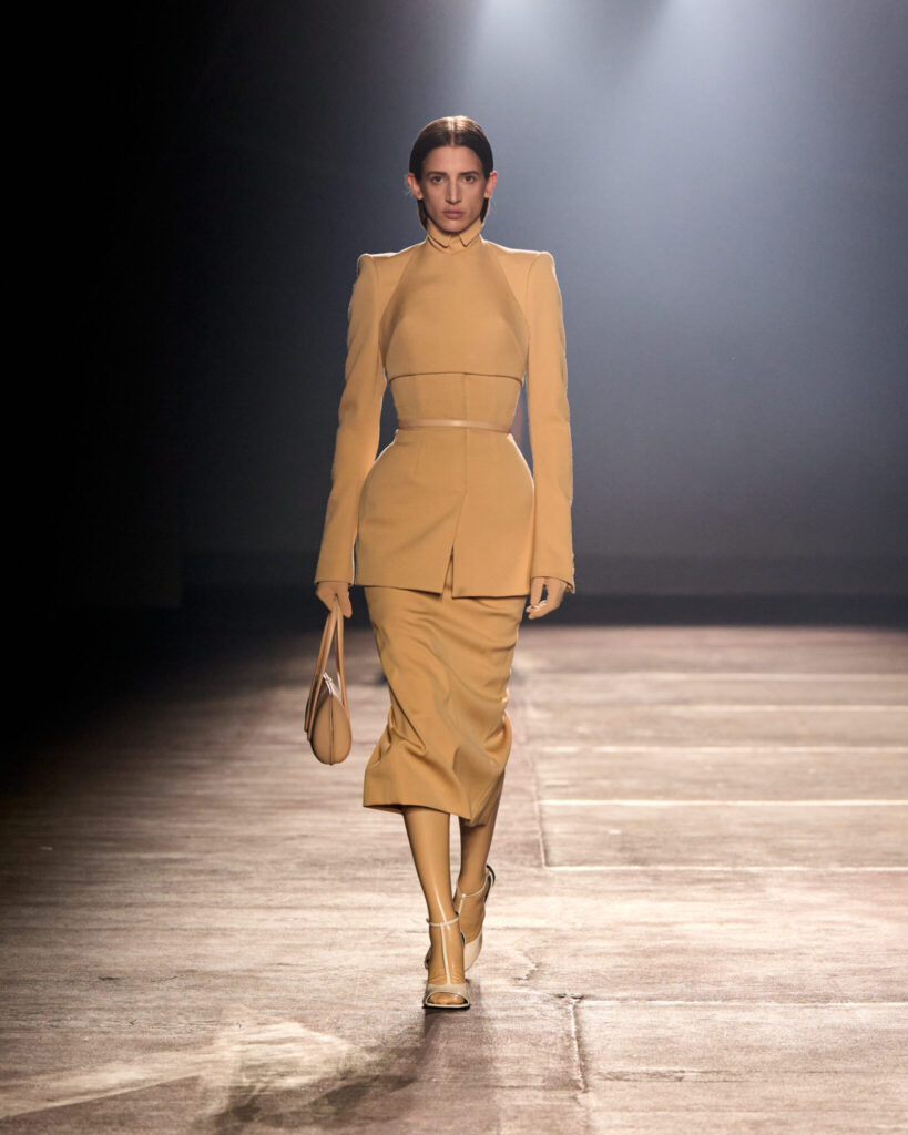 Following the path of the French house’s signature terrain, nearly every look featured Mugler’s snatching hourglass silhouette, exaggerated by padded waistlines and pointed shoulders. The runway’s shadowy stage complemented the collection’s tonal shades of blacks, browns, and beige. Freitas balances the dualities of form and of the house—exposed and concealed, soft and rigid, theatrical and reality. While looks maintained their archival structure, tailoring was softened by wearable silhouettes. Still, at the center, a winged avian bodice claims the hero slot along with a twin-plumed skirt. The drama of Mugler is freshened, grounded in relatability.
