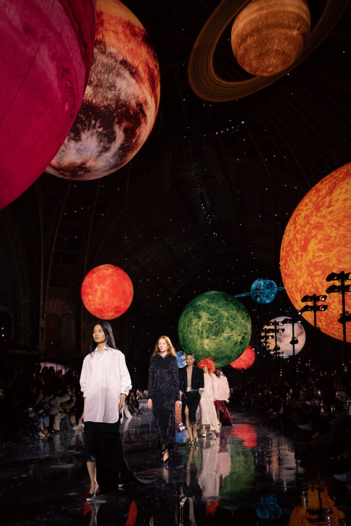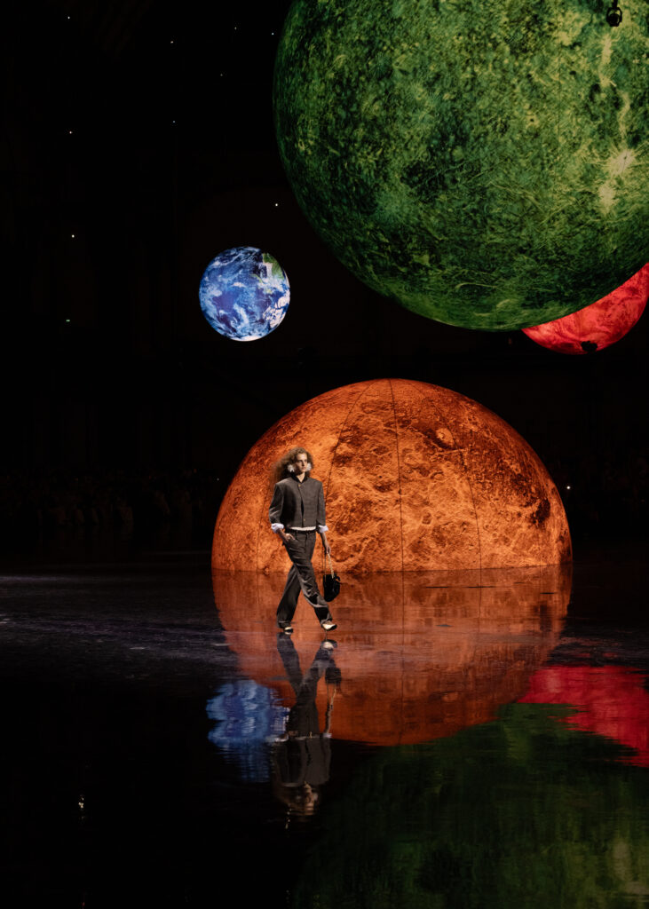 Back in Paris’ Grand Palais, the ballroom was decorated with a suspended solar system, gargantuan 3D glowing planets, and a glossy galaxy runway. The celebrities began to file into the front row. Margo Robbie, Kendall Jenner, Vanessa Paradis and daughter Lily-Rose Depp, Pedro Pascal, Nicole Kidman, and the newest and first Blazy appointed Chanel girl, Ayo Edebri, each took their seats. Eventually, the room glittered from its starry audience, anticipation only rising, ready for Blazy’s Big Bang.