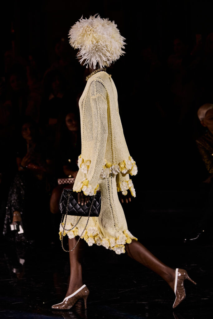 The classic Chanel tweed coat is characterized by an oval silhouette with a fluffier texture and decorative trimmings. Not unlike the Maison’s past collections, tweed is continuously reinterpreted, but this season in novel textures and movements. The slouchy knit three-piece was a standout—an open, grid knit resembling a tweed plaid pattern of Chanel’s past. A plaid knee-length skirt mimics the same style, rendered in a light sheer fabric.
