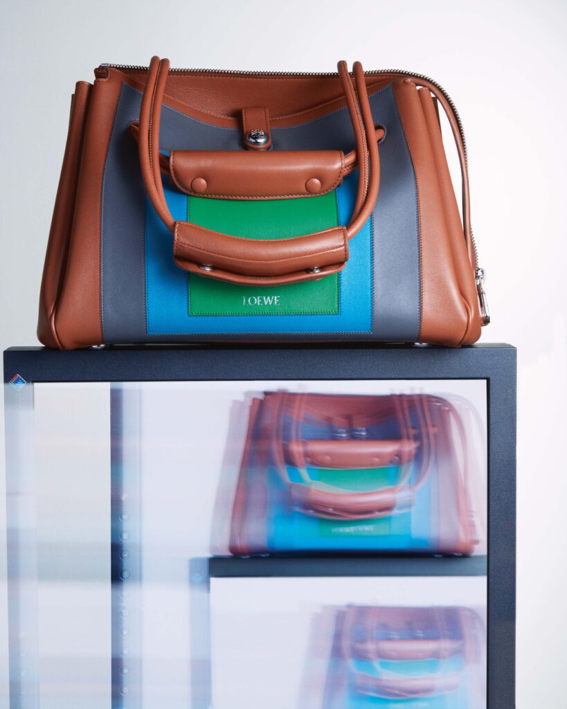 There is a hush before sunset on Calle de Alcala, when the sky shifts to deep cobalt, the Retiro’s treetops flash emerald, and the rooftops toast mellow tobacco. Loewe translates that evening light into leather and form with the house’s new Madrid bag. Tubular handles pad the grip, pleated walls shift and gather with every move, and a gold Pebble snaps shut with the rhythm of castanets. The zip runs slightly askew, adding a touch of mischief to the clean structure, while nappa lining keeps it in place. In its color-blocked glory, the Madrid bag arrives in cobalt, meadow green and toasted tobacco, three shades drawn from the FW25 collection’s tribute to Josef Albers’s Homage to the Square.