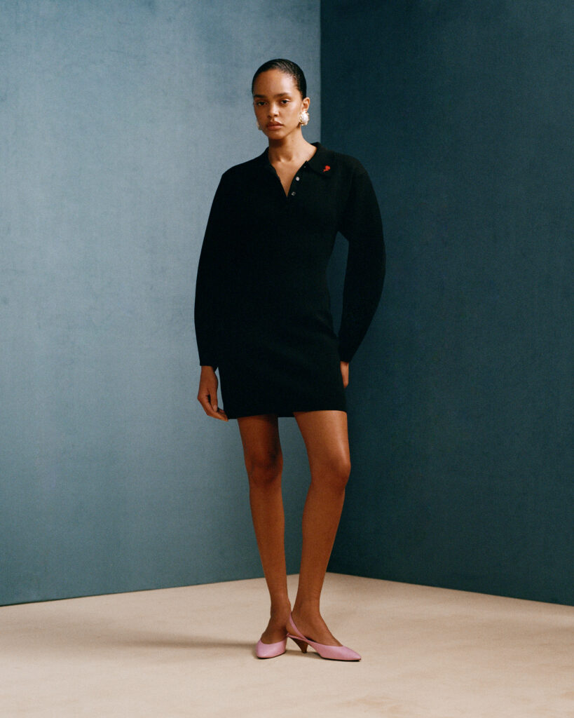 On the women’s side, floral bow-tie tops, lace dresses, pencil skirts, and shoulder-padded blazers nod to Chavarria’s strong silhouettes. Red rose motifs bloom across polo skirts and shirts, a recurring emblem in Chavarria’s visual lexicon. Romantic yet grounded, the pieces reframe everyday staples into something distinctly sharp and personal, through a lens that is at once personal and culturally resonant.