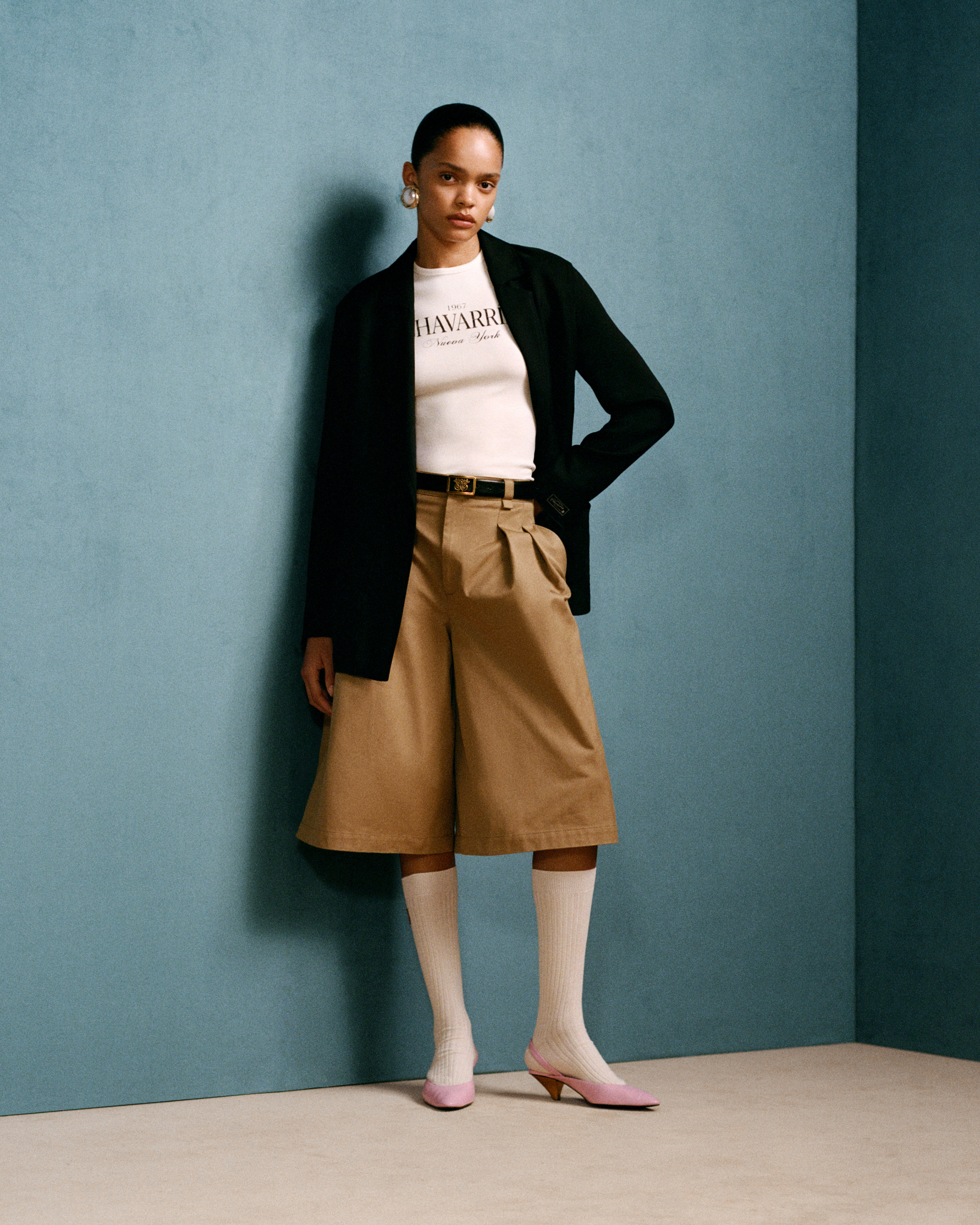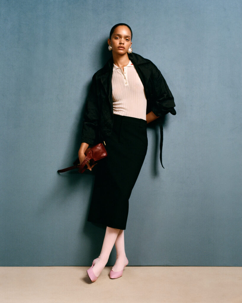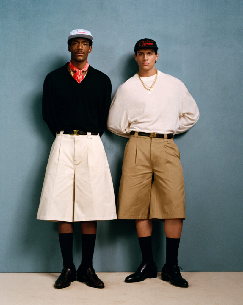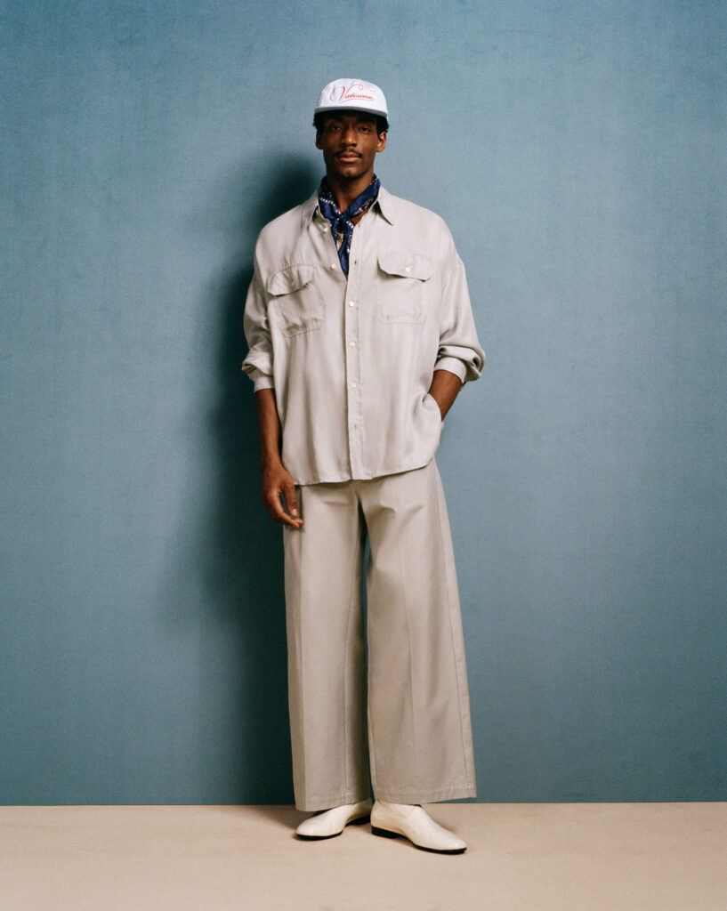 Across men’s and women’s wardrobes, Chavarria leans into his signature styles: crisp silhouettes, precise tailoring, and bold, preppy hues. For men, wide-leg khaki and cream shorts, voluminous slacks, and Cuban-heeled leather loafers define the offering. A thread of American workwear runs through the collection, seen in short-sleeved style shirts in raw-edged cupro and leathered belts and bags.