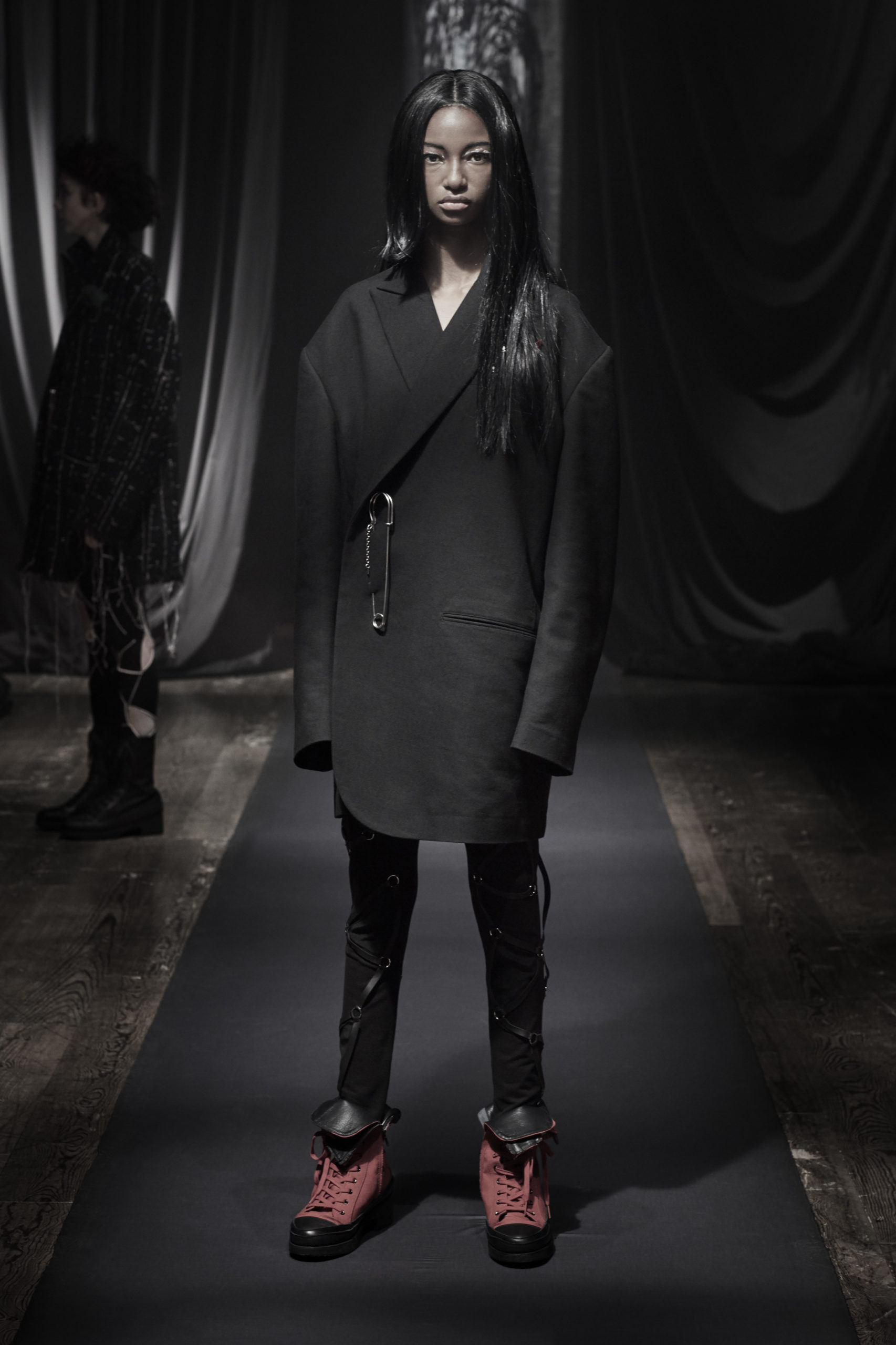 Solemn music provides a backdrop for gothic elegance. A cap sleeve gown with asymmetrical front detailing represents the beauty of simplicity, perhaps a commentary on the times we currently find ourselves in having abandoned opulence of yesteryear for a less complicated, more stationary lifestyle. An oversized black blazer is in tune with the must-have coat trend of the moment. Instead of buttons, however, Yamamoto opts for a supersized safety pin. The look is paired with hiking boot-like footwear — another trend box checked in Yamamoto fashion. The simple silhouettes are embellished with wires and chains as an announcement of an upcoming Yohji Yamamoto accessory line.